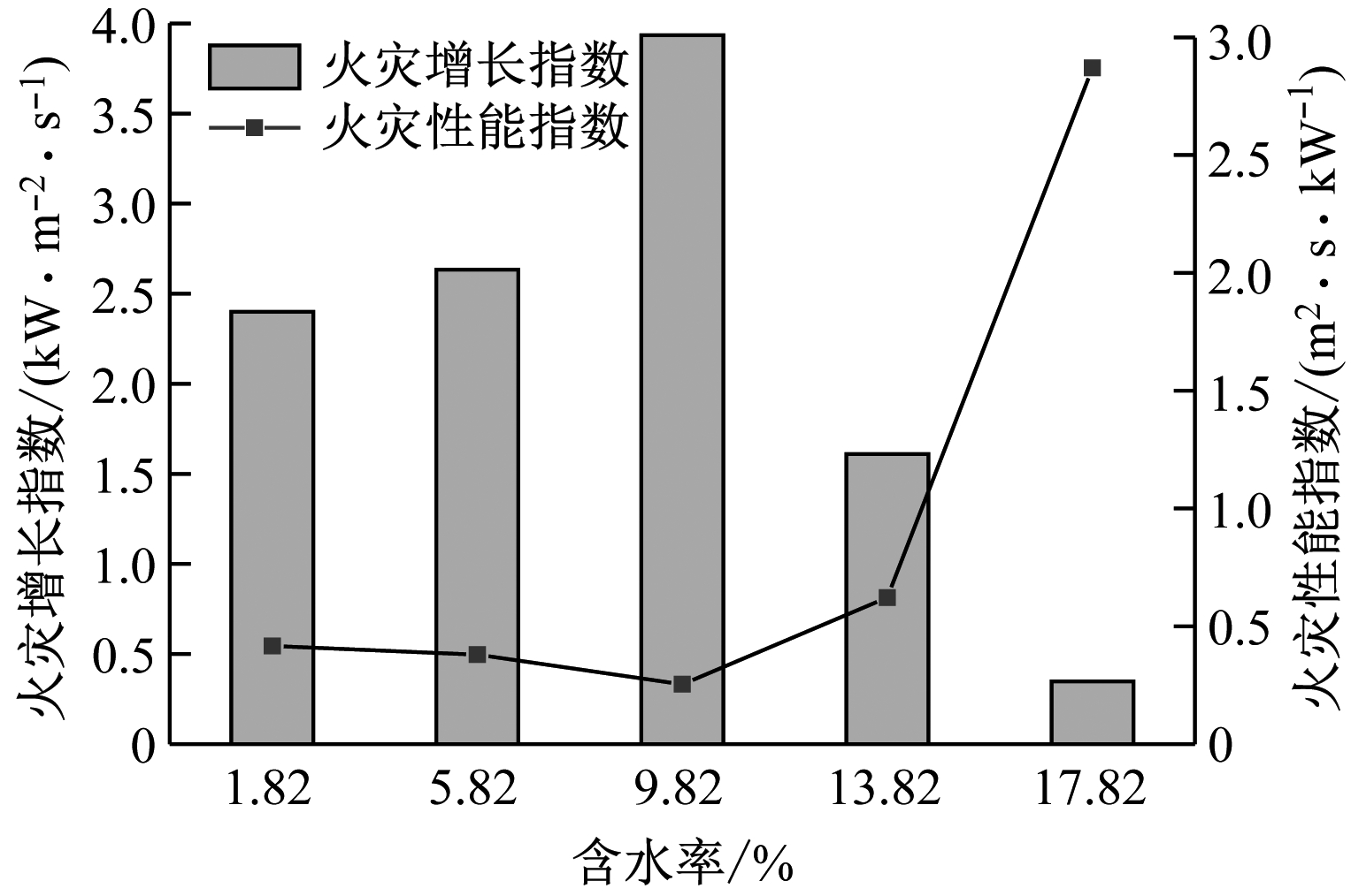 为更全面地分析不同含水率煤样燃烧效率,引入火灾性能指数和火灾增长指数。火灾性能指数越高、火灾增长指数越低,煤样燃烧效率越低[15]。