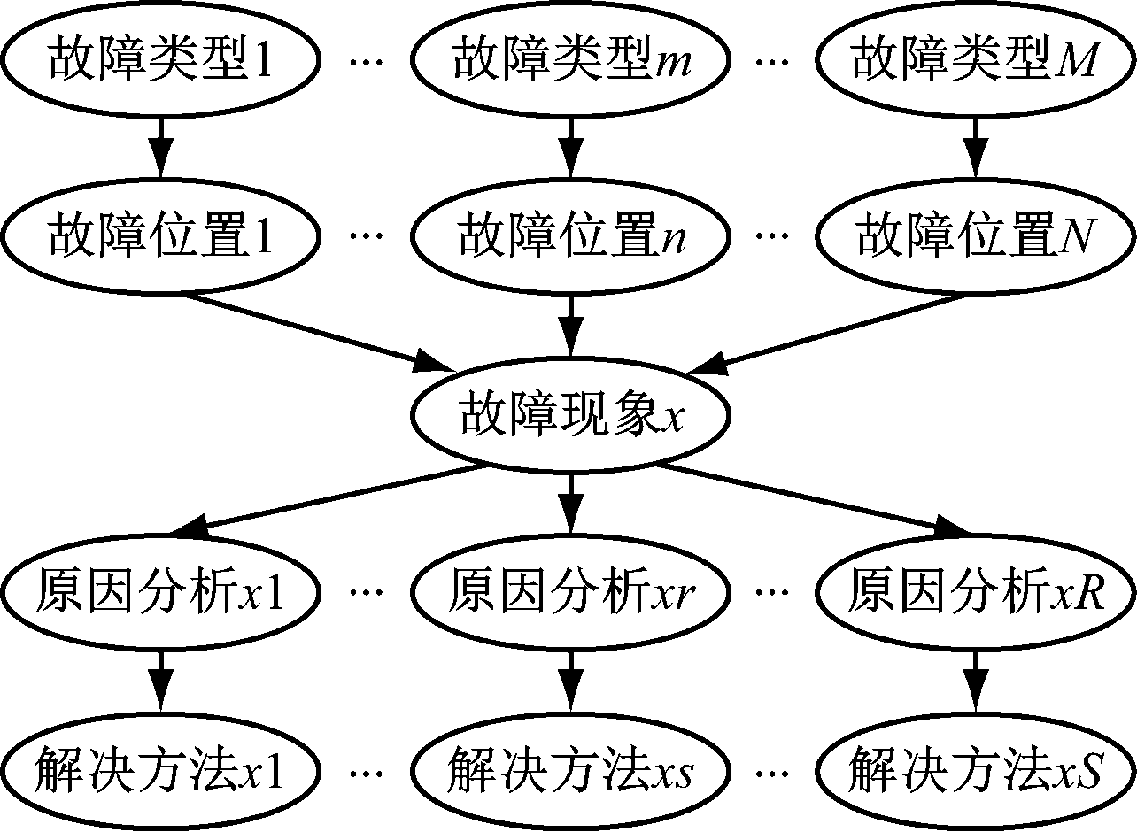 Eft采用实体→关系→实体的结构模式描述,具体内容包括采煤机故障→type_of(关系)→故障类型,故障类型→location_of(关系)→故障位置,故障位置→phenomenon_of(关系)→故障现象,故障现象→cause_of(关系)→原因分析,故障分析→solution_of(关系)→解决方法。采煤机故障检修子网络图如图6所示。其中,M为故障类型总数,m=1,2,…,M;N为故障位置总数,n=1,2,…,N;R为故障现象x的原因总数,r=1,2,…,R;S为故障现象x的解决方法总数,s=1,2,…,S。