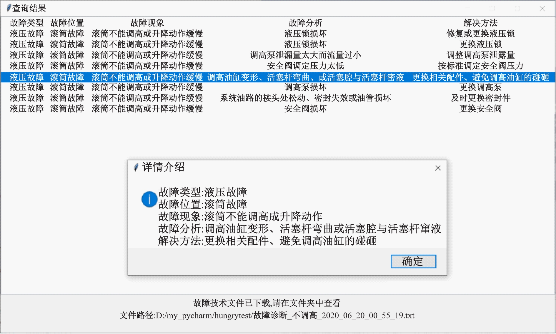 使用Py2neo库中的Node,Relationship及Graph实现知识库智能交互。Node用于创建节点实体,Relationship用于创建连接实体的关系,Graph用于故障查询。假设某采煤机发生故障,通过传感器传来的数据初步断定属于液压故障,故障位置在滚筒,故障现象是滚筒升降出现问题,提取关键词“不能调高”“升降”,在查询系统中输入关键词进行查询,查询结果如图11所示。双击查询结果,得到详细的故障内容,包括故障现象分析和解决方法等。