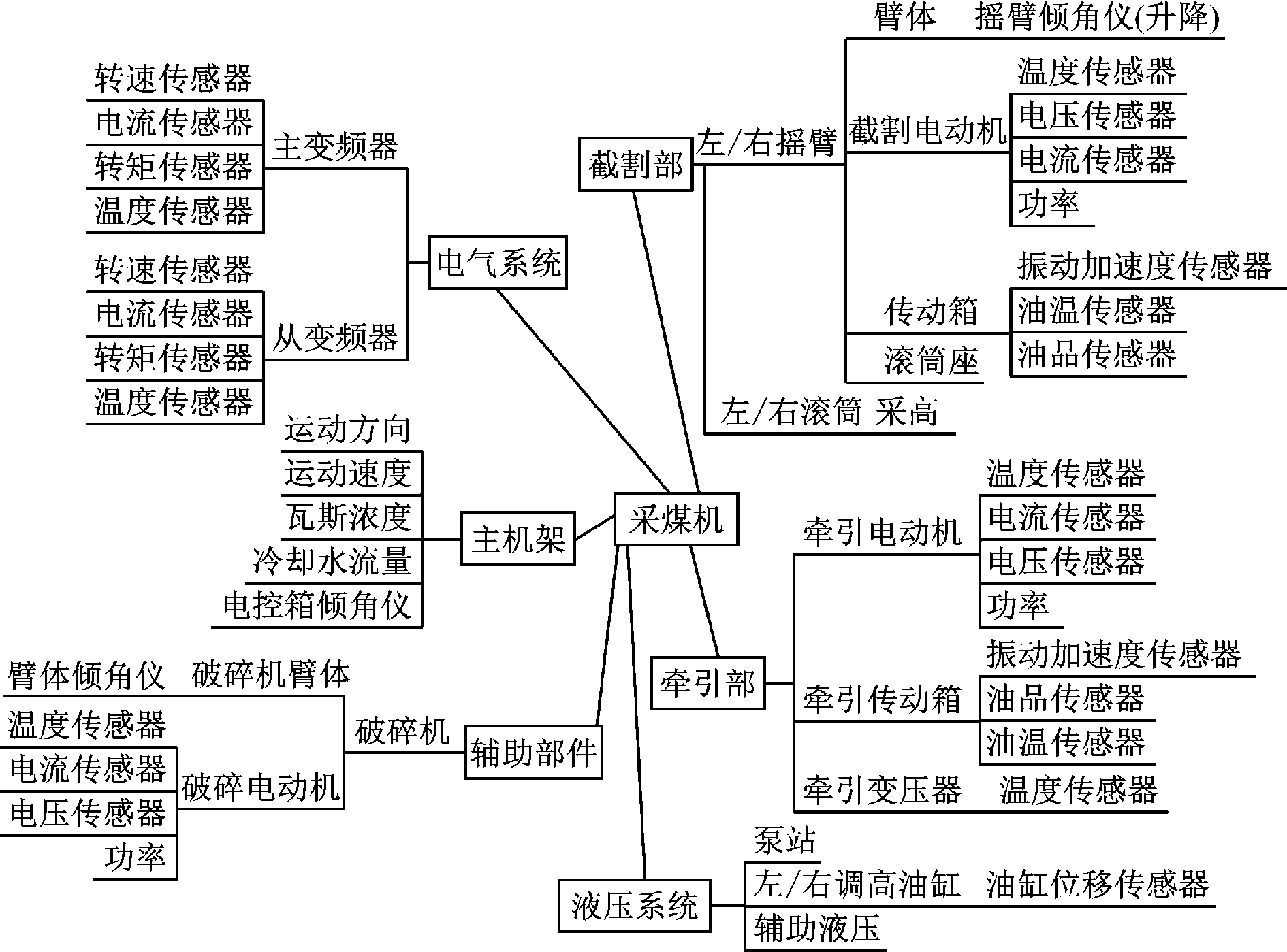 通过采煤机控制状态及运行状态的变化反映采煤机真实服役状态是一种有效且可行的手段。整理MG400/930-WD交流电牵引采煤机的各个监测点位,得到采煤机传感监测点分布,如图4所示。根据各项监测指标命名传感监测实体,最终对应采煤机硬件拓扑结构的实体命名,得到传感器实体。