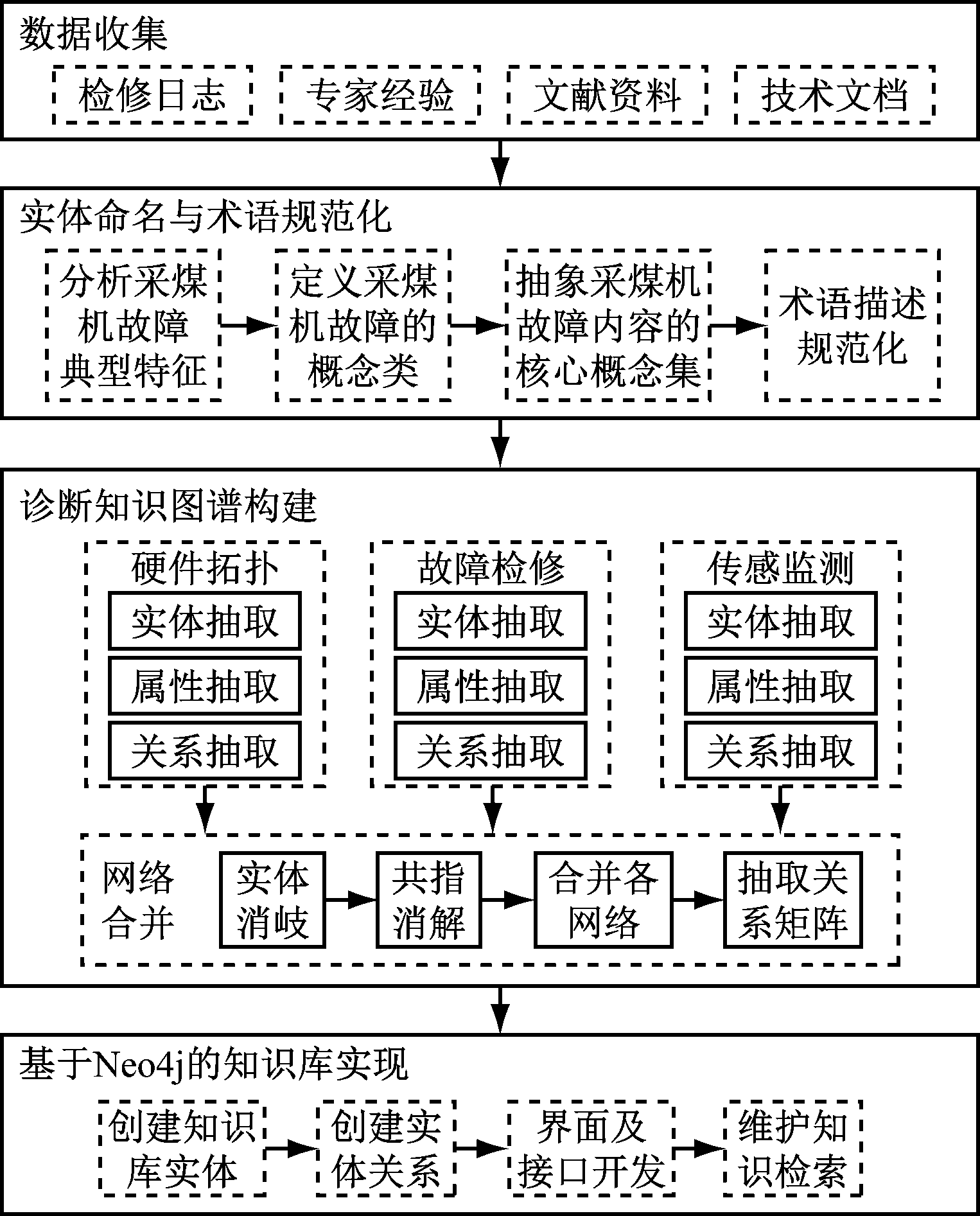 大量学者针对摇臂、齿轮箱、轴承等采煤机关键元部件的运行状态监测与故障诊断进行了卓有成效的研究[1-3],然而元部件级故障诊断分析不能从众多耦合因素中精确定位潜在故障源。尤其是处于极端恶劣工况下的采煤机关键元部件失效触发因素大幅增加,目前没有成熟的方法满足设备多部件协同工作条件下的故障源精确定位需求[4-6]。本文从采煤机整机角度分析各元部件协同关系,引入知识图谱技术,系统地研究各故障源的耦合程度,通过图论中的节点关系图直观描述设备运行过程中产生的各种信息及其复杂关联关系,形成面向采煤机故障检修的智能维护知识图谱,以图谱的形式固化采煤机故障检修知识,配合相关故障诊断模型与算法,实现故障源快速准确定位及潜在故障点精准管控,达到故障前有效预防、故障后及时维修和止损的目的。