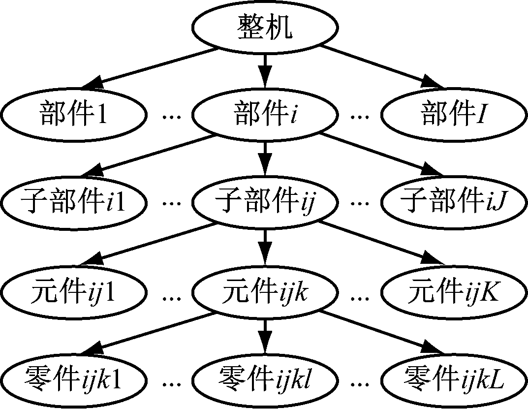Est采用实体→关系→实体的结构模式描述,具体内容包括整机→component_of(关系)→部件,部件→subcomponent_of(关系)→子部件,子部件→unit_of(关系)→元件,元件→part_of(关系)→零件。采煤机硬件拓扑子网络图如图5所示。其中,I为设备整机的部件总数,i=1,2,…,I;J为部件i的子部件总数,j=1,2,…,J;K为子部件ij的元件总数,k=1,2,…,K;L为元件ijk的零件总数,l=1,2,…,L。