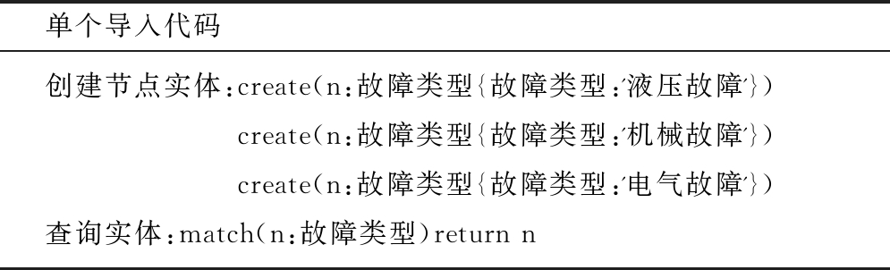 (1) 单个导入。采煤机发生的故障属于液压故障的故障率为80%,因此,在进行故障分类时将其从机械故障和电气故障中分离出来。对于3种故障类型实体,采用单个分别导入的方法。Cypher导入代码如下。