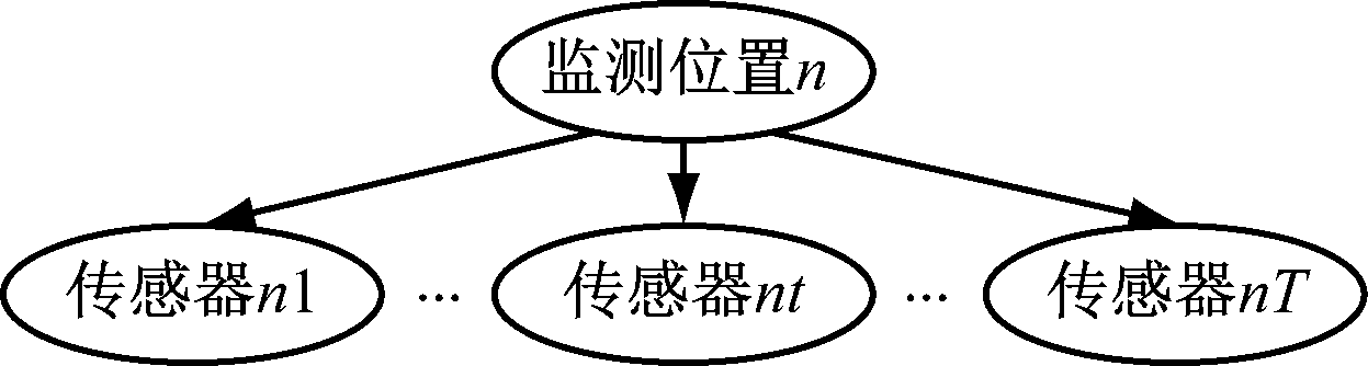 Ese采用实体→关系→实体的结构模式描述,具体内容为传感器→monitor_of(关系)→位置。采煤机传感监测子网络图如图7所示。其中,T为故障位置n处的传感器总数,t=1,2,…,T。