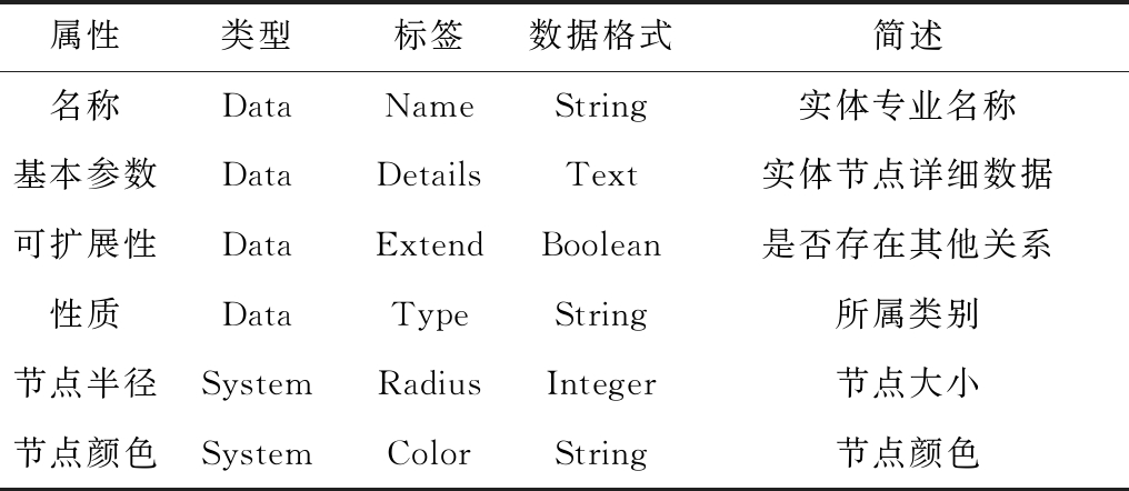 属性类型标签数据格式简述名称DataNameString实体专业名称基本参数DataDetailsText实体节点详细数据可扩展性DataExtendBoolean是否存在其他关系性质DataTypeString所属类别节点半径SystemRadiusInteger节点大小节点颜色SystemColorString节点颜色