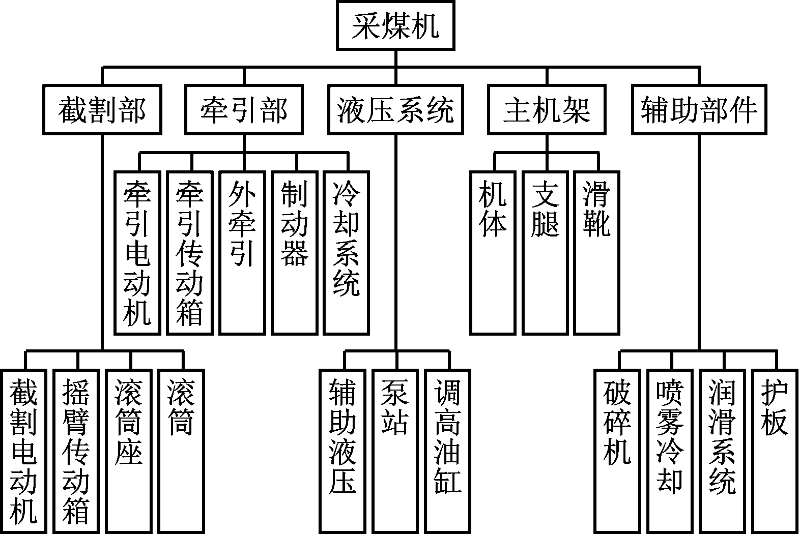 选用MG400/930-WD交流电牵引采煤机作为研究对象,该型号采煤机具有多电动机驱动、横向抽屉式布置、机载式交流变频调速等特点,适用于较倾斜、中硬煤层长壁式综采工作面,采高范围为2~3.5 m。其典型机械部件包括左右摇臂、左右滚筒、牵引传动箱、外牵引、泵站、牵引电动机调速装置、高压控制箱、调高油缸、主机架、辅助部件、电器系统及附件等。