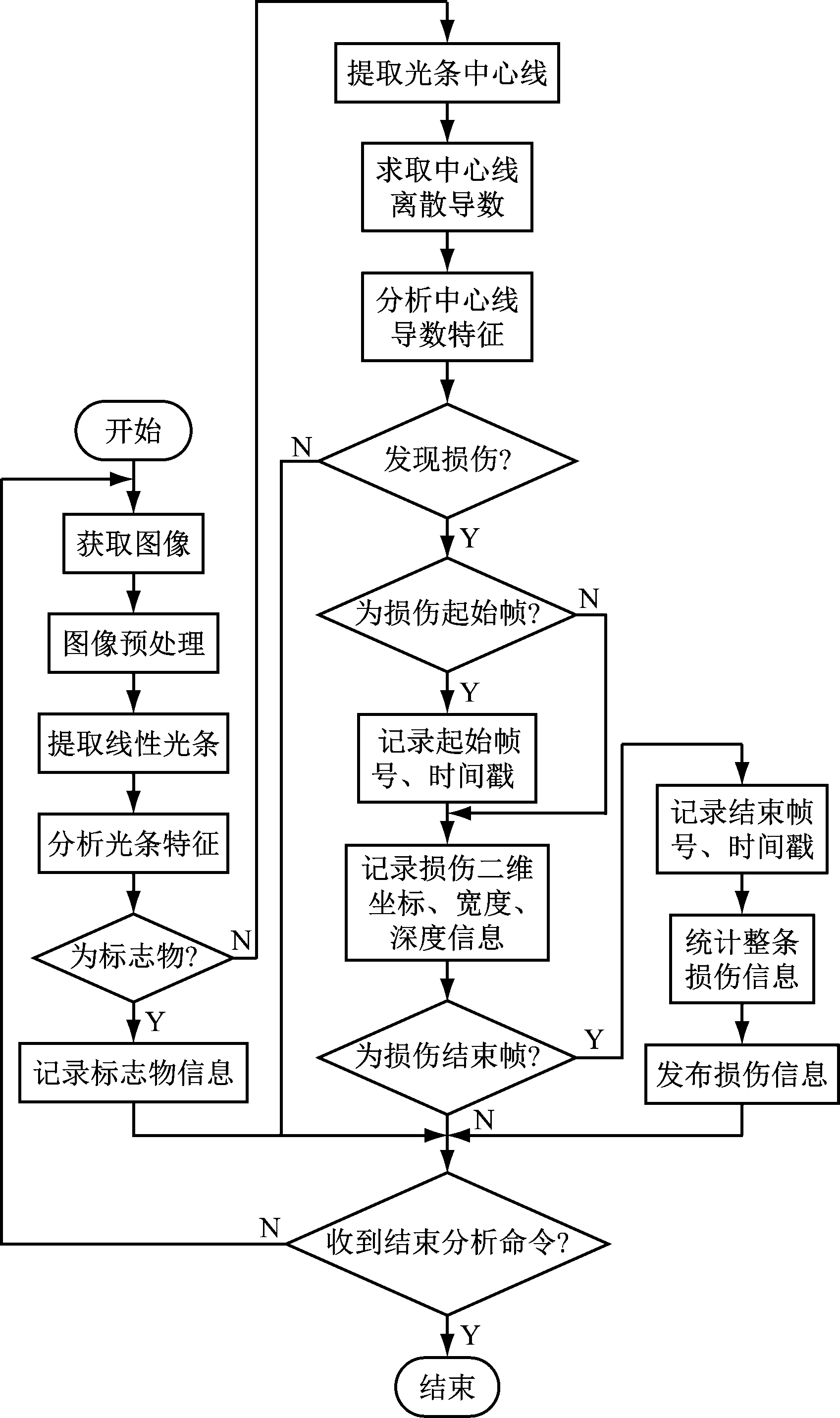 当检测到损伤结束点时,即完成1道光条上的损伤检测与记录。为了获取整条完整损伤的特征值(包括长度、平均宽度、平均深度等),需要分析损伤起点帧到结束帧的多帧图像,并融合速度传感器数据进行计算。