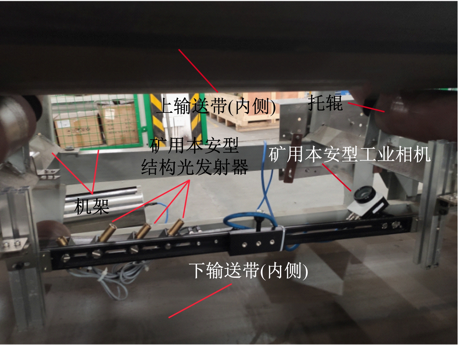 试验装置包括带式输送机、矿用本安型结构光发射器、矿用本安型工业相机、矿用本安型多传感融合计算盒等,如图4所示。结构光发射器与工业相机固定在带式输送机机架上,位于上下输送带之间。结构光发射器向上输送带背面发射3道线性激光,工业相机镜头朝向上输送带背面,与结构光发射器相向,用于采样3道线性激光覆盖的输送带区域图像,采样速率设定为25 帧/s。