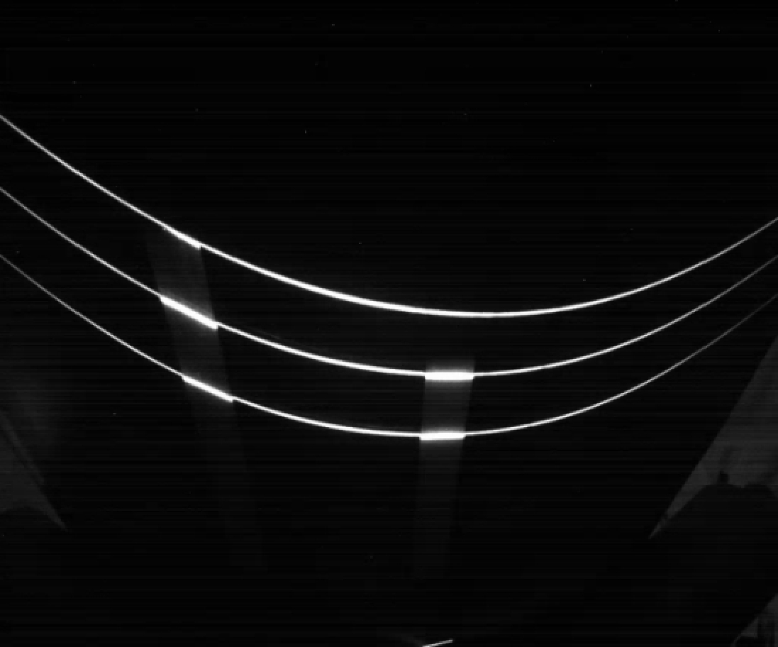 人为在输送带指定位置粘贴反光条作为标志物,以定位撕裂损伤在输送带上的纵向位置。标志物图像如图2所示。由于反光条有反光效果,标志物在图像上呈现较粗的短光条段。