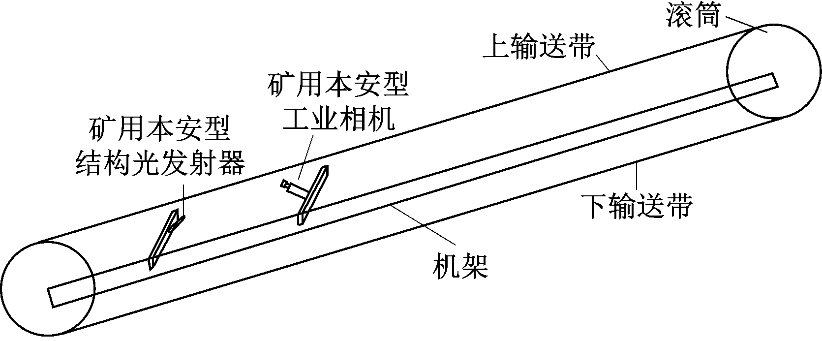 带式输送机纵向撕裂检测方法基于矿用本安型工业相机、矿用本安型结构光发射器和矿用本安型多传感融合计算盒实现,采用机器视觉技术,对带式输送机正常运行过程中的输送带上下表面进行实时扫描和分析,融合速度传感器输出值,对输送带纵向撕裂进行检测与跟踪。