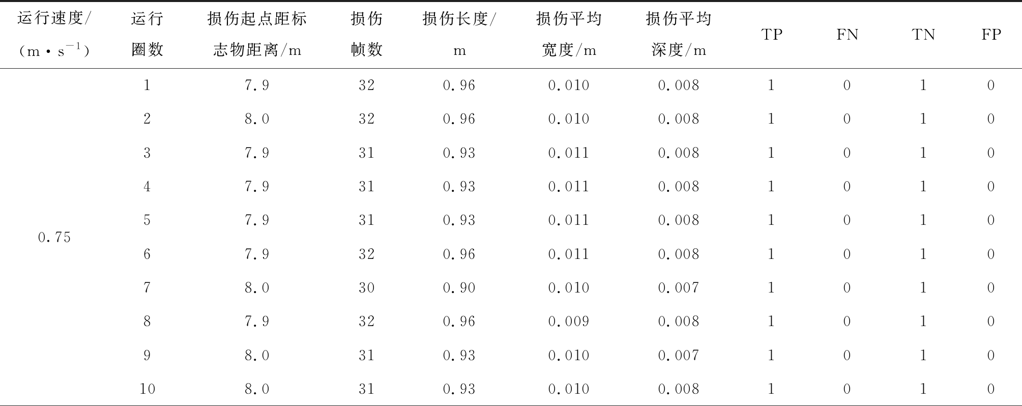 运行速度/(m·s-1)运行圈数损伤起点距标志物距离/m损伤帧数损伤长度/m损伤平均宽度/m损伤平均深度/mTPFNTNFP17.9240.720.0110.008101027.9230.690.0100.008101037.9250.750.0110.008101047.9240.720.0120.008101057.9250.750.0110.00810100.7568.0240.720.0110.008101078.0240.720.0110.008101088.0240.720.0100.008101098.0230.690.0090.0071010108.0240.720.0100.008101017.9120.720.0100.008101027.9120.720.0090.008101037.9120.720.0100.008101047.9120.720.0100.008101057.9120.720.0110.00810101.567.9120.720.0100.008101077.9110.660.0090.008101087.9110.660.0100.007101097.9120.720.0120.0081010107.9120.720.0100.008101018.060.720.0100.008101028.060.720.0100.008101038.060.720.0100.008101048.050.600.0100.007101058.060.720.0110.00810103.068.060.720.0100.008101078.060.720.0100.008101088.060.720.0100.008101098.040.480.0100.0081010108.060.720.0100.0081010