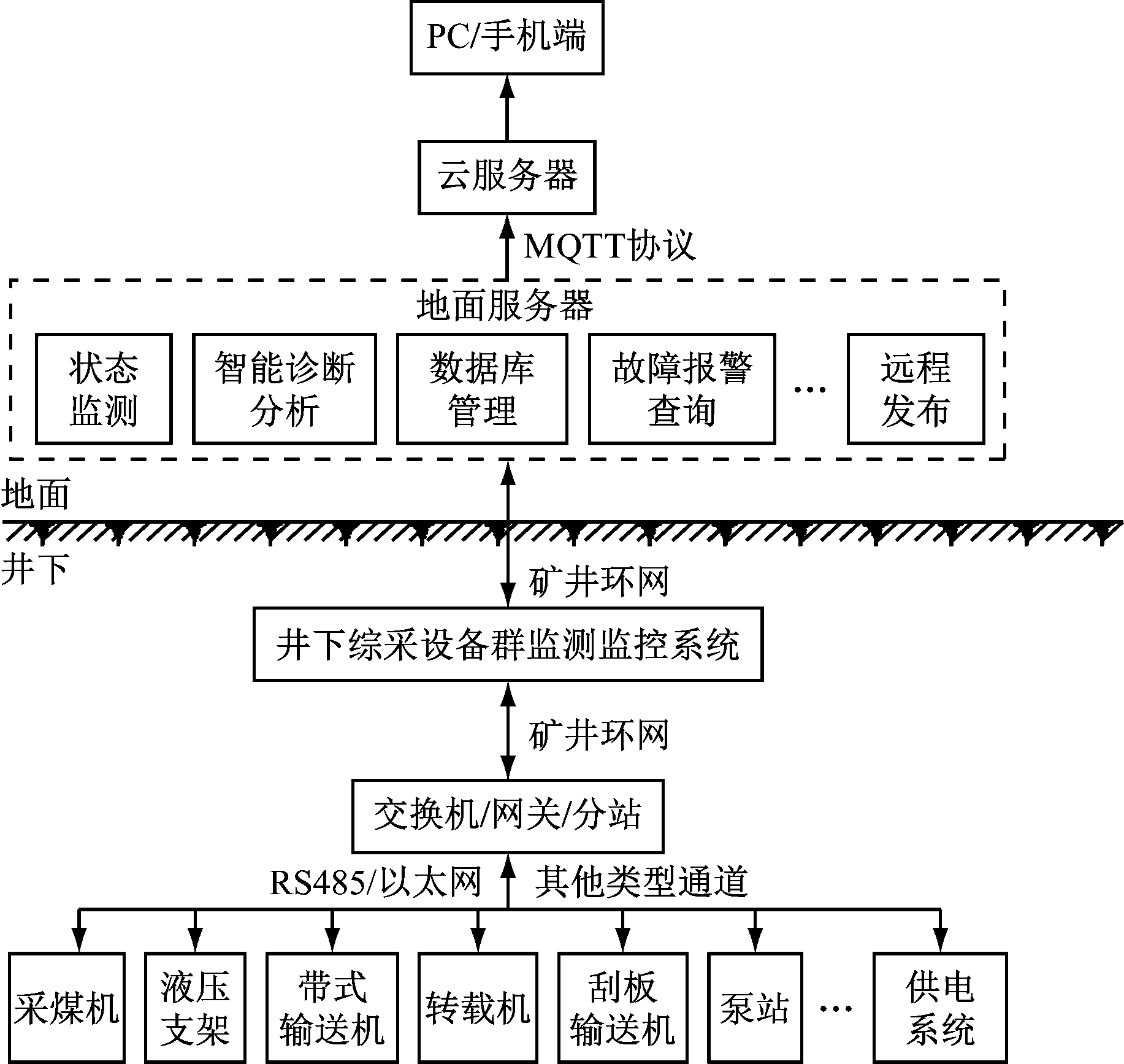 目前,从我国经济社会发展的趋势及能源结构分布来看,到2050年煤炭依然是我国的主体能源。在智能煤矿、智慧矿山建设的背景下,煤矿安全、高效、绿色、智能开采的理念需要综采设备远程故障诊断与健康维护方面的技术强有力支撑[1]。综采设备工作环境恶劣,在运行时极易受到冲击载荷、煤尘等的影响,故障时有发生,轻则影响煤矿企业生产效率,重则导致设备损坏、生产中断,造成重大的经济损失甚至人员身亡。因此,研发基于云平台的综采设备远程故障诊断系统,对其故障进行在线诊断和预警,有助于预防综采设备故障的发生和保障综采设备安全运行,对保证煤矿安全高效生产、提高维护效率和降低维护成本具有重要的现实意义。