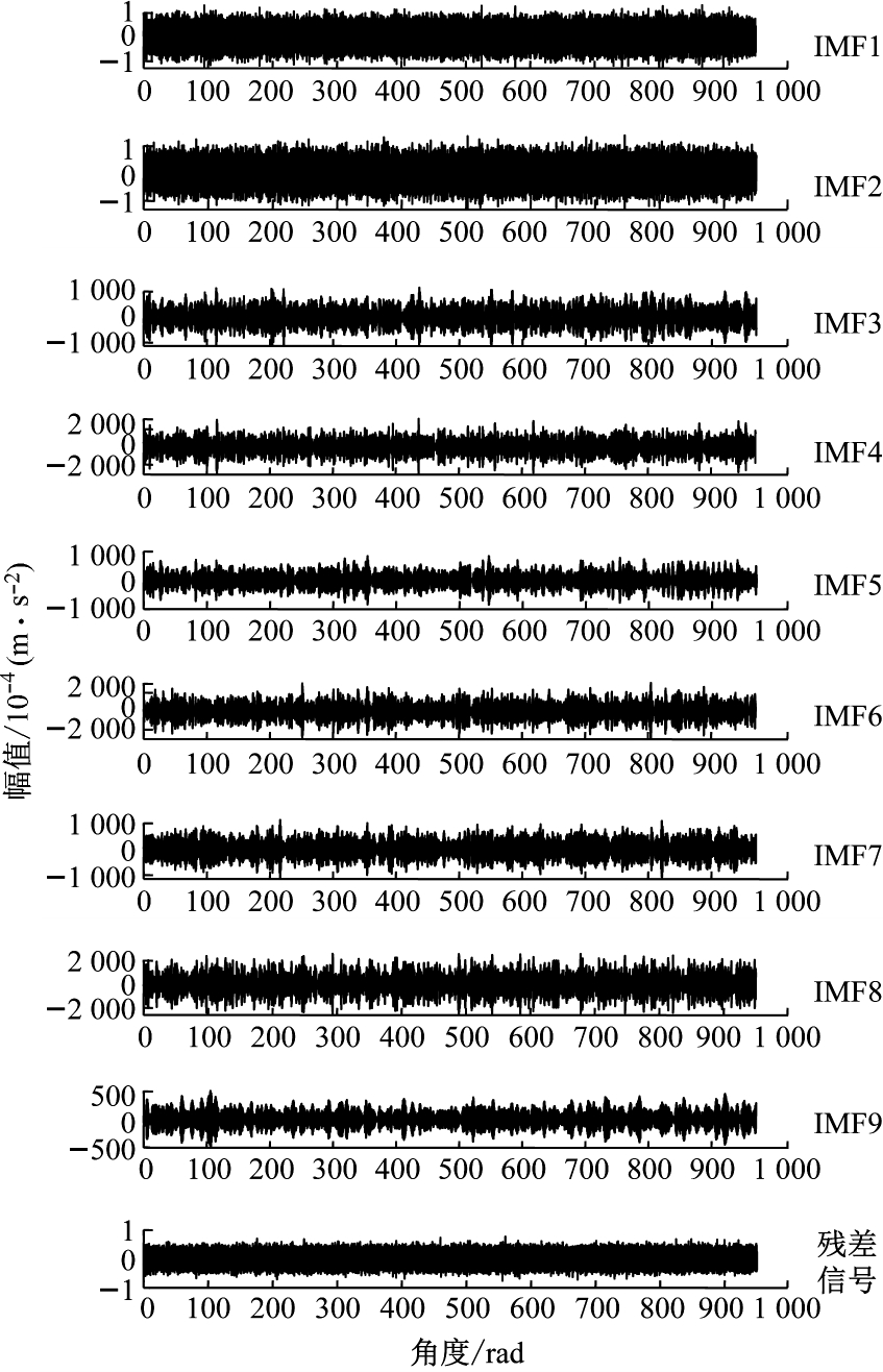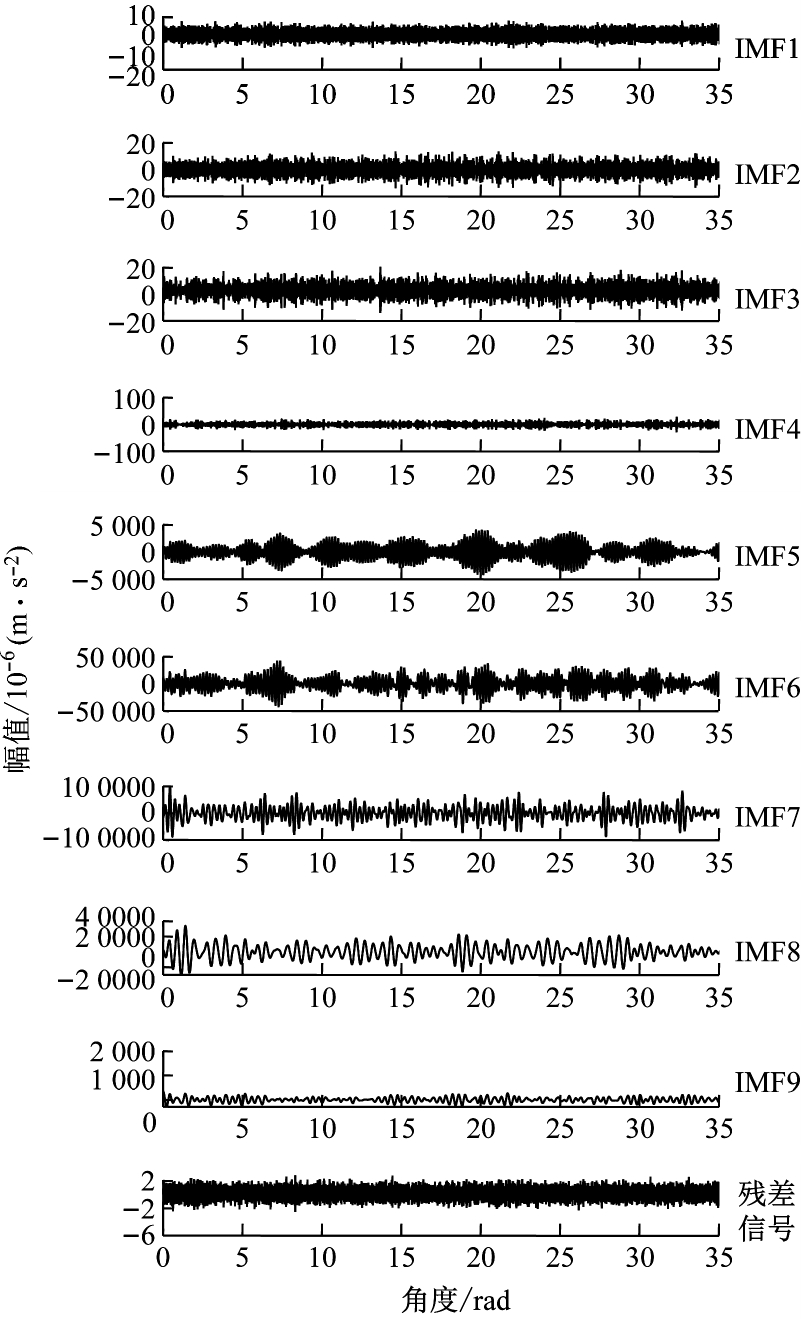 采用计算阶次分析方法对信号进行角域重采样,重采样后的信号及其共振解调后的结果如图3所示,图3(a)、(b)分别表示角域信号重采样后的平稳角域信号及阶次谱图,故障阶次被噪声完全淹没。通过共振解调结果(图3(c)、(d)),只能微弱地发现阶次为3的故障阶次,周边噪声干扰仍然很大,容易造成误判,因此,需要进一步进行分析判断。采用滤波方法滤除非故障特征范围的干扰成分,采用VMD方法对信号进行分解来识别信号中的特征成分,分解后的结果如图4、图5所示。图4为各个IMF分量与残差信号的角域波形,对图4各分量进行傅里叶变换得到图5,图5为各个IMF分量与残差信号的阶次谱。
