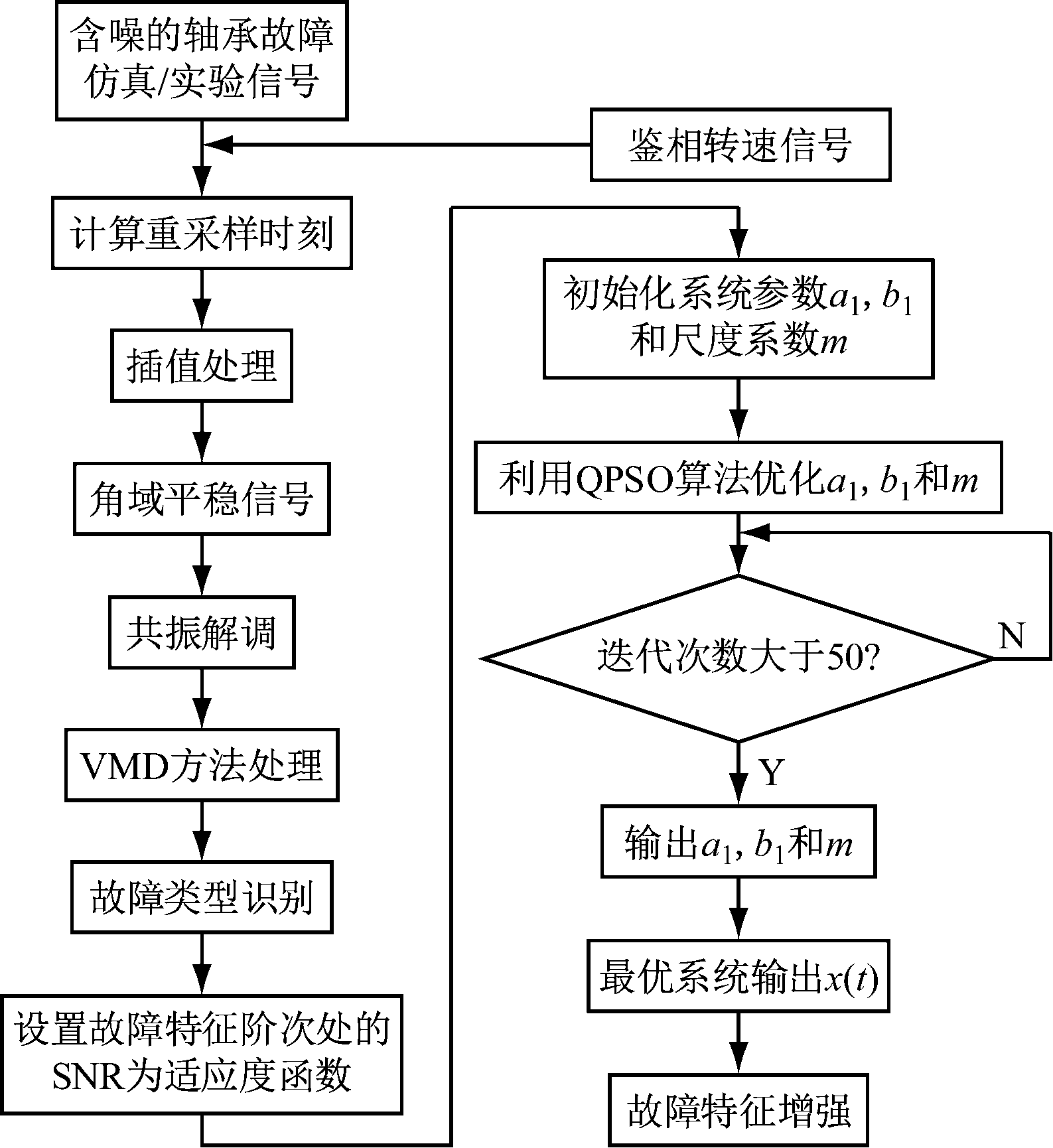 首先,利用计算阶次分析将非平稳的含噪轴承故障信号转换为角域平稳信号,以消除转速波动的影响;然后,利用共振解调技术和VMD方法实现信号内故障分量的判断,确定故障特征阶次与类型;最后,将信号输入到双稳态系统中,利用SNR作为优化指标,采用QPSO算法对系统参数a1, b1和尺度系数m进行优化,达到迭代终止条件后输出最优系统参数及增强后的特征信号。