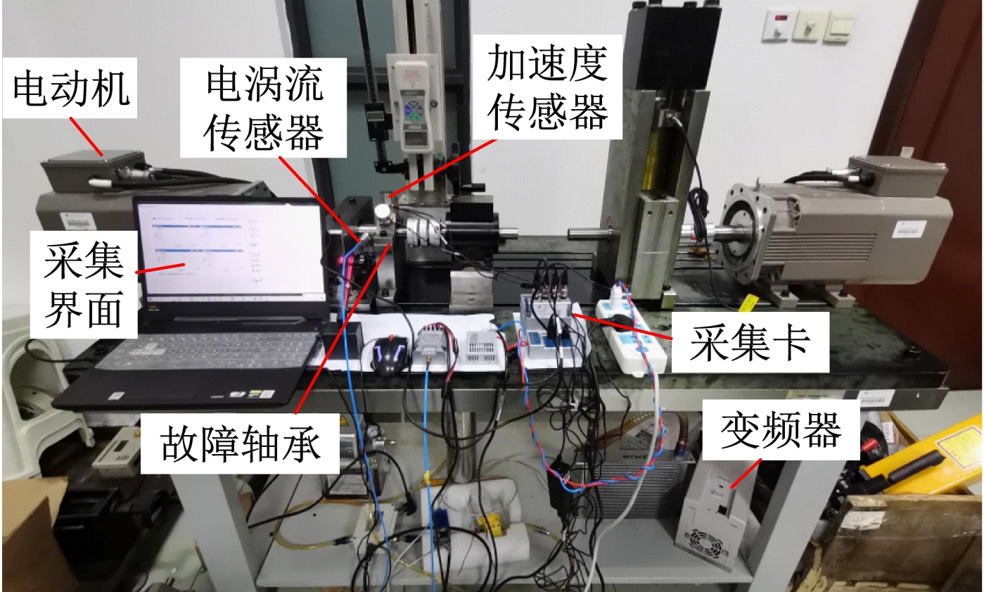 通过一组轴承故障实验数据来验证上述方法的正确性。轴承型号及参数见表1,实验台如图7所示。该实验台主要由电动机、5E103型电涡流传感器、1A206型加速度传感器、上位机采集界面、NI9234型信号采集卡、变频器等组成,其中变频器用于电动机调速,控制电动机通过联轴器传递力与扭矩到故障轴承,通过采集轴承旋转过程中轴承端盖的振动信号和电涡流传感器所测的参考轴转速信号对轴承的运行状态进行分析。设采样频率为10 240 Hz,转速为1 300 r/min→1 500 r/min→1 300 r/min,采集时间为40 s。