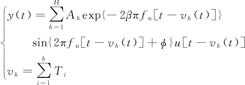 式中:y(t)为外圈故障特征仿真信号;Ah为第h个故障脉冲幅值,h=1,2,…,H,H为脉冲总个数;β为阻尼系数; fn为轴承的固有频率;vh为h-1个脉冲出现的总时间;φ为初始相位;u(t)为单位阶跃函数;Ti为第i个脉冲在发生时刻的重复周期。