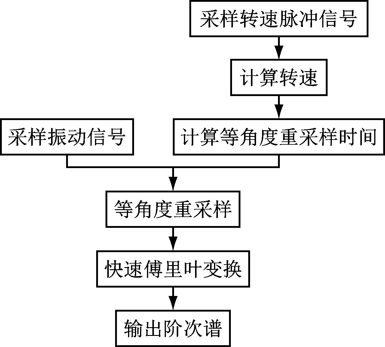 计算阶次跟踪(Computed Order Tracking, COT)[9-10]是目前应用最普遍的阶次分析技术,其在测量轴上安装1个转速计,与振动传感器同时采样信号,以获得同步数据,再根据转速信号计算等角度重采样时间,对原始振动信号在重采样时间进行插值处理,以获得等角度重采样数据,实现阶次跟踪,如图1所示。该方法简化了硬件,通过上位机实现等角度重采样,降低了信号分析成本,且稳定性较强,可保证较高的精确度。