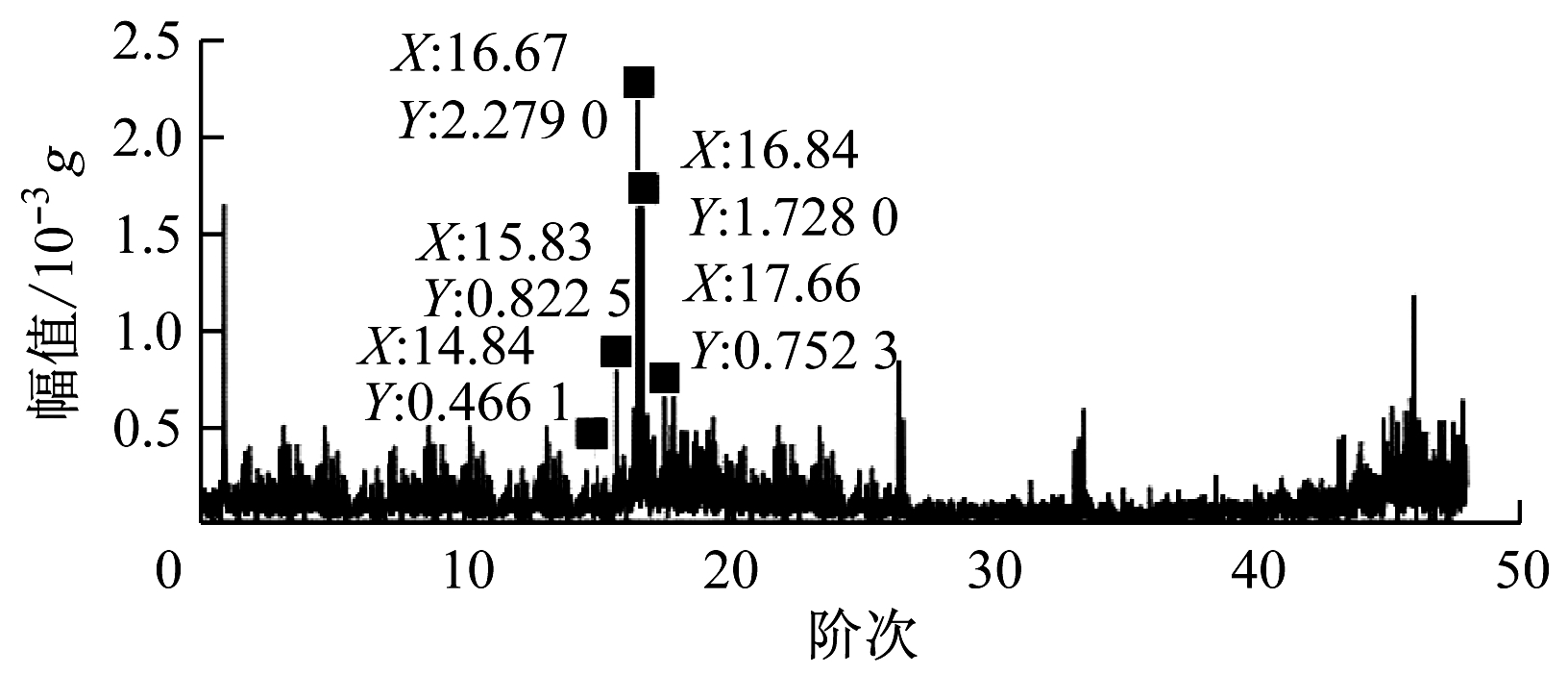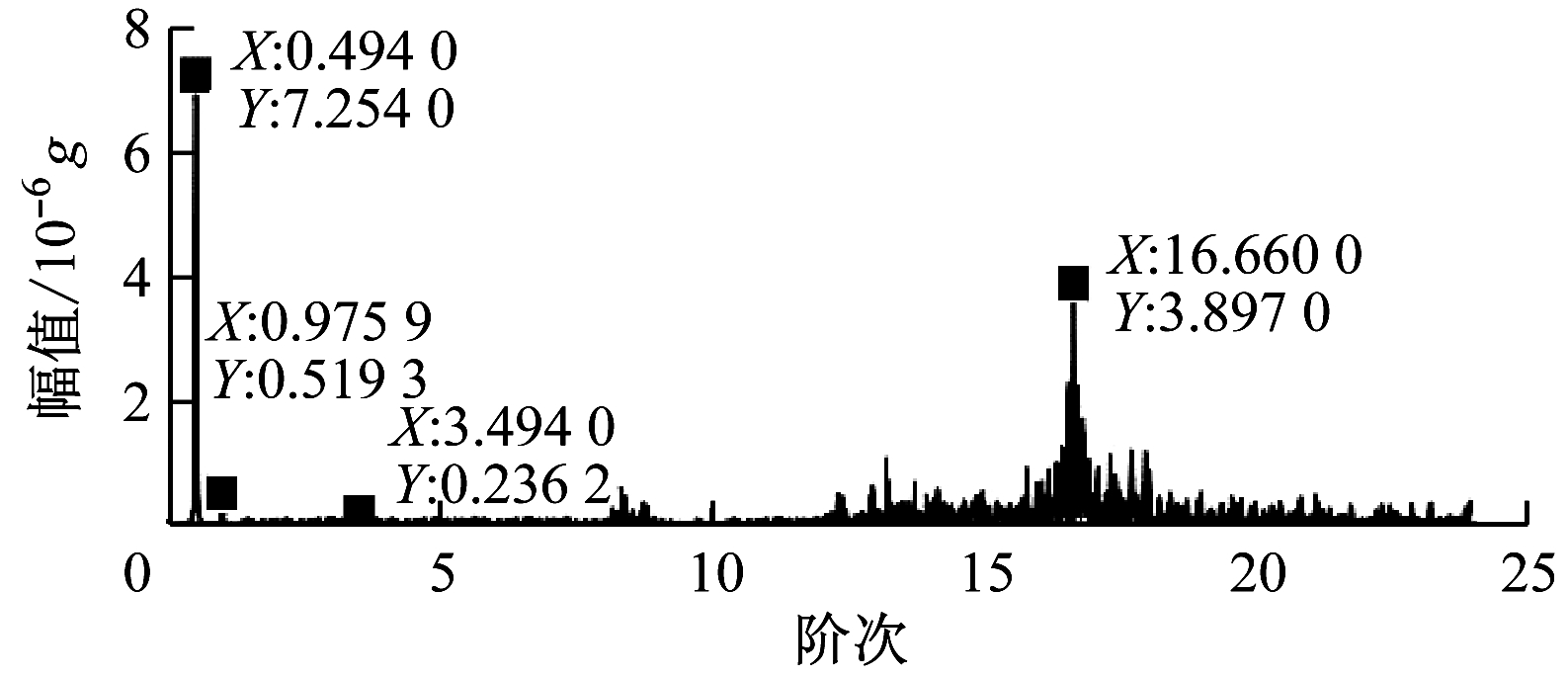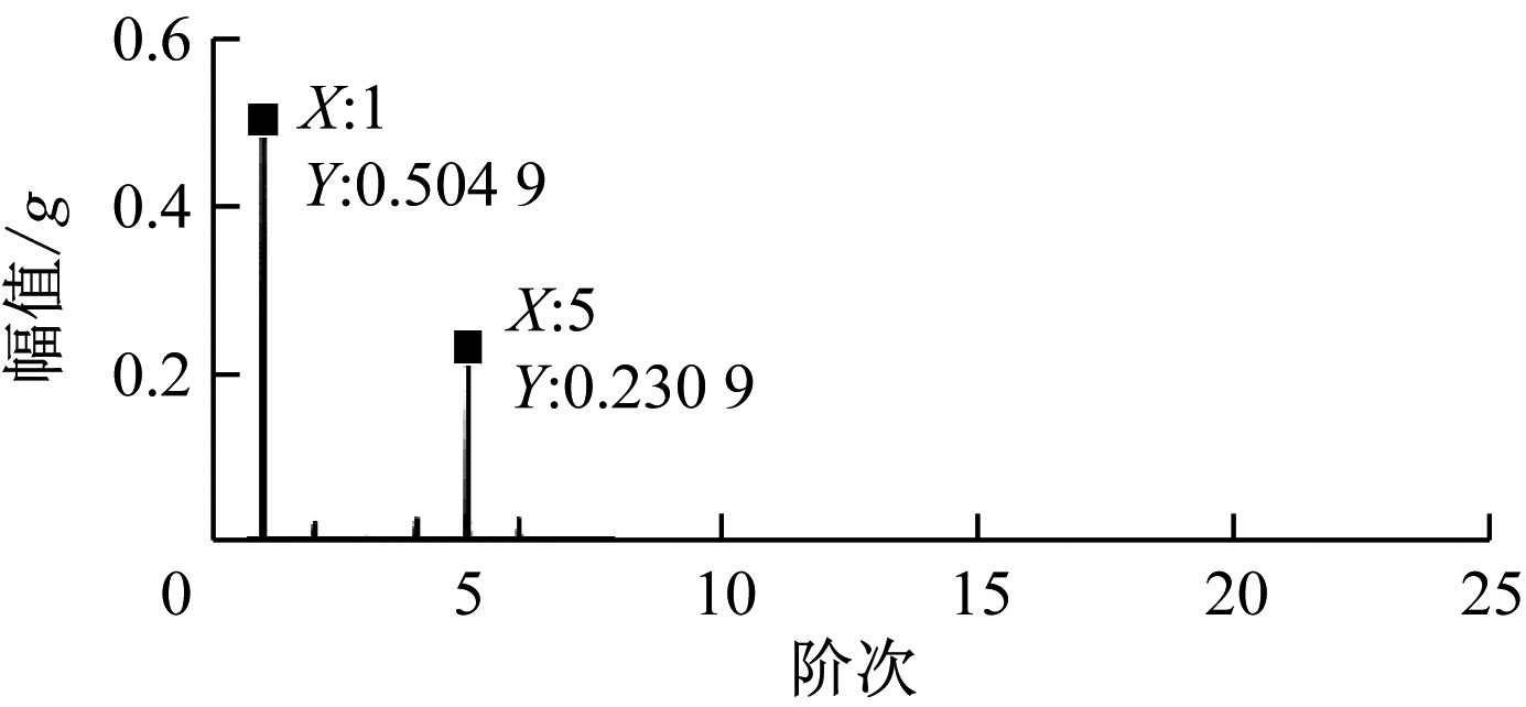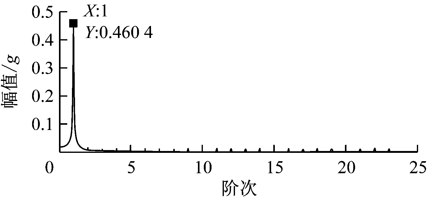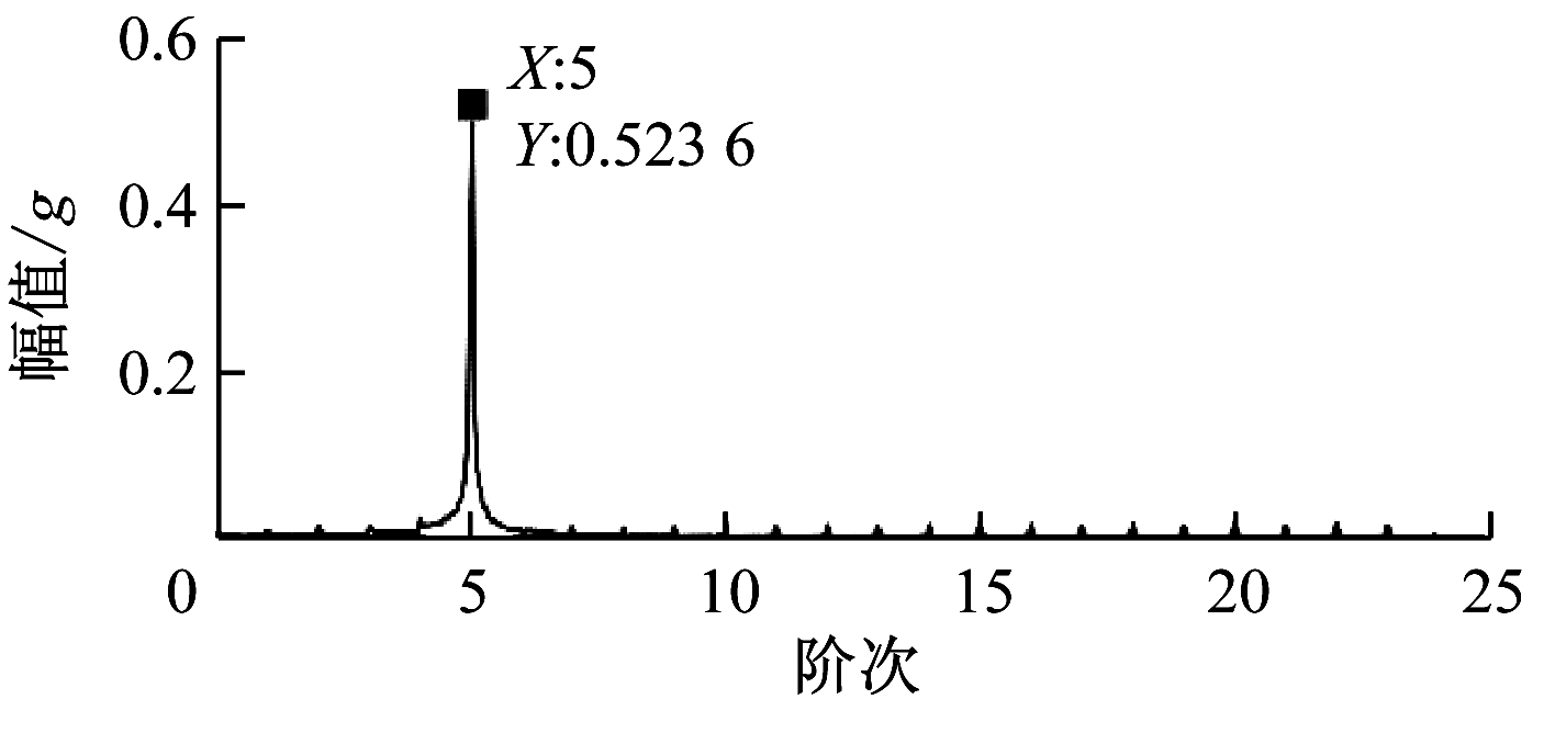将式(5)代入式(8)得到整个时间序列后,对原始振动信号进行三次样条插值,得到各个时间节点对应的角域幅值曲线,即角域信号。对其进行频谱分析即可得到信号阶次谱。