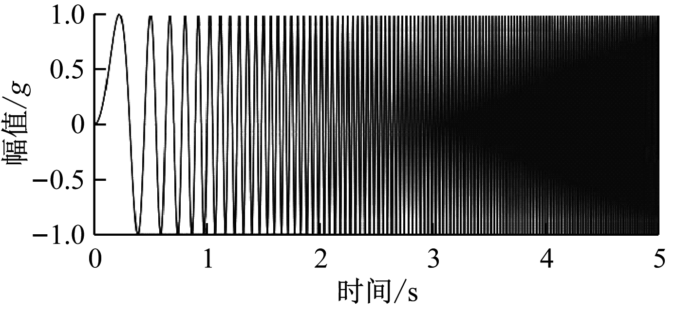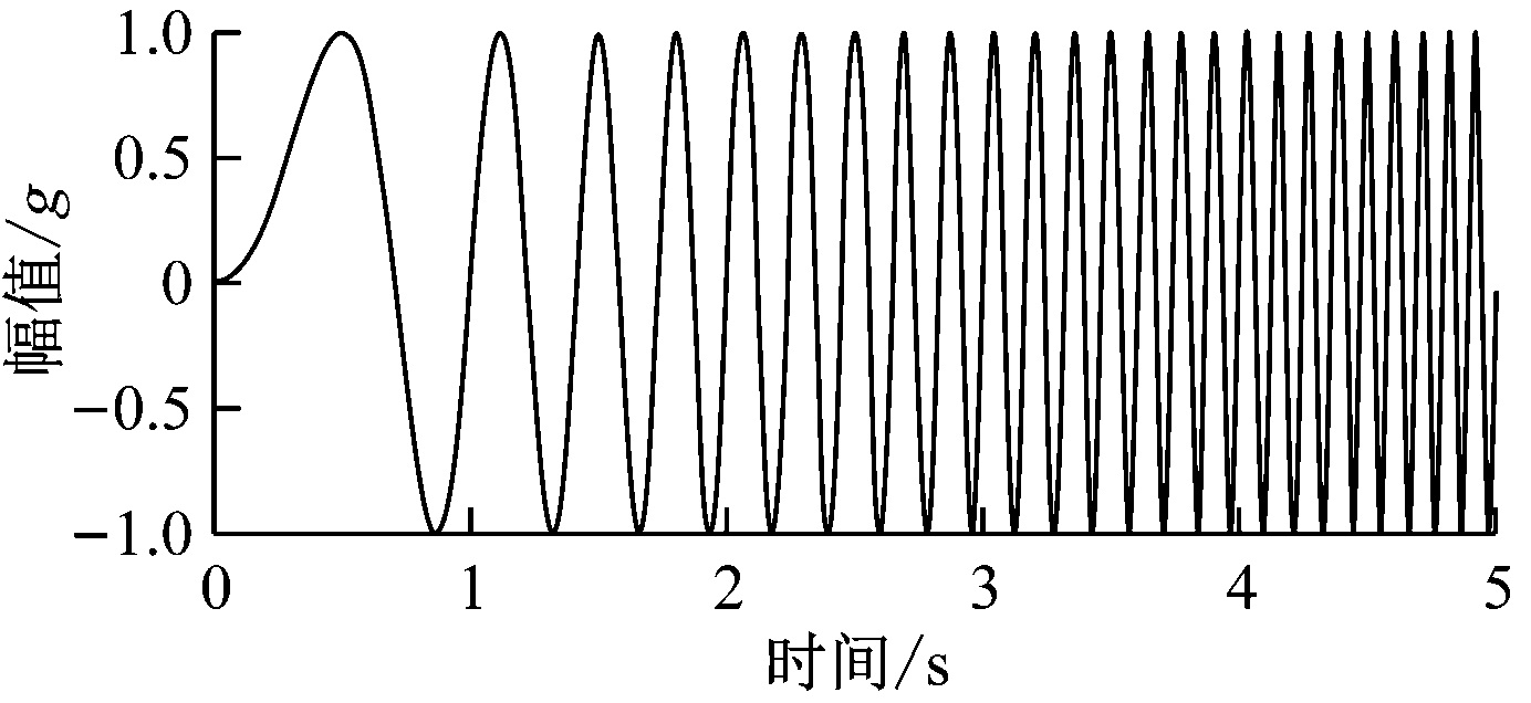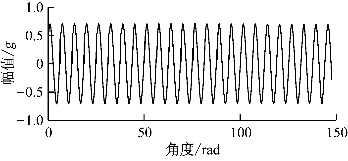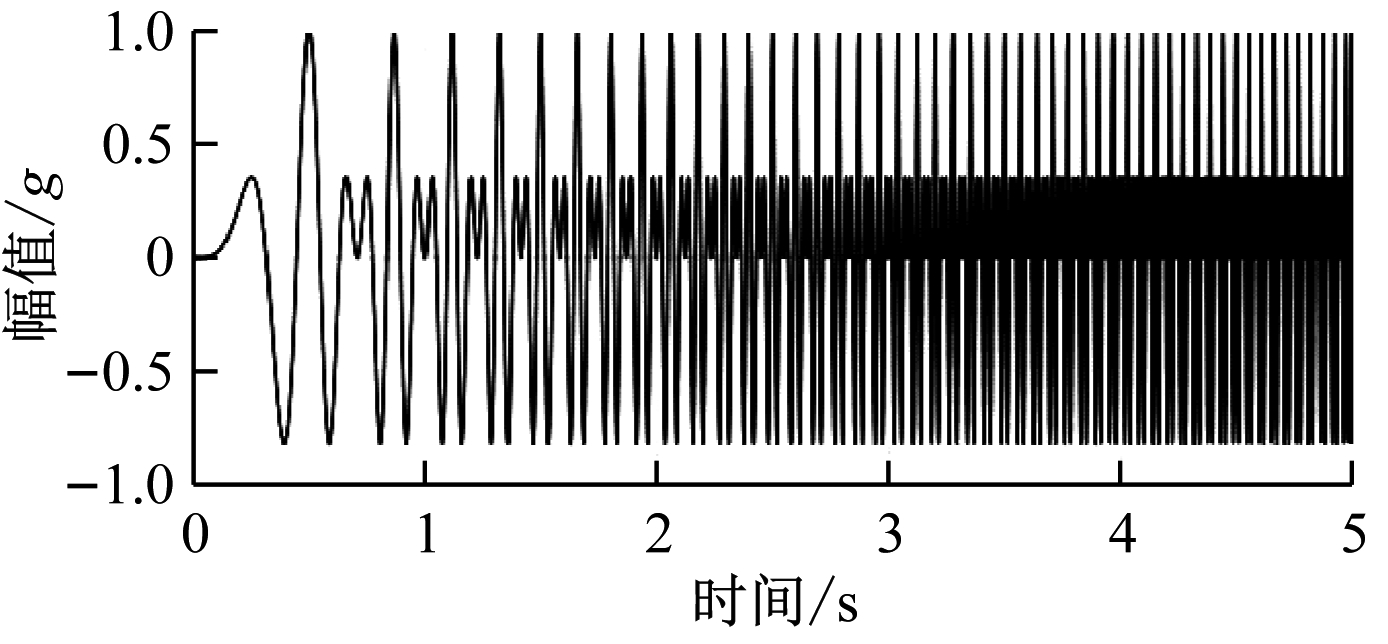 低频信号x1(t)为被调制信号,高频信号x2(t)为载波信号。由式(1)可得x1(t),x2(t)的特征阶次分别为1,5。x1(t),x2(t)波形分别如图3、图4所示,其中g为重力加速度。可看出x1(t),x2(t)频率逐渐增大,通过频谱分析难以辨别信号特征。