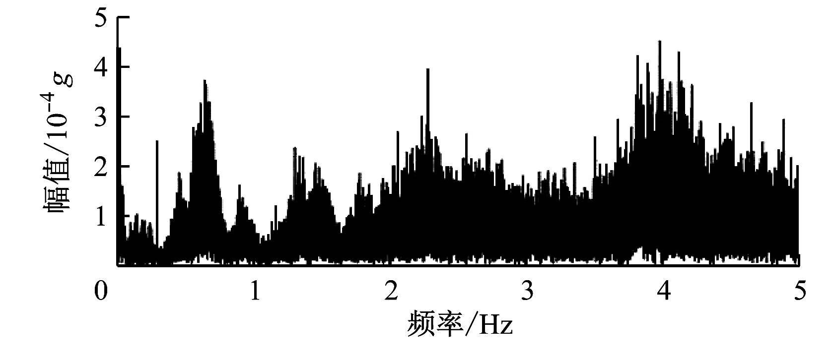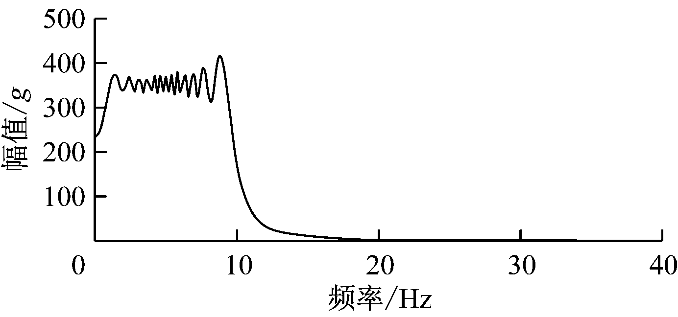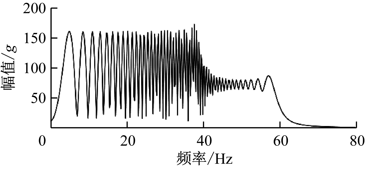 低频信号x1(t)为被调制信号,高频信号x2(t)为载波信号。由式(1)可得x1(t),x2(t)的特征阶次分别为1,5。x1(t),x2(t)波形分别如图3、图4所示,其中g为重力加速度。可看出x1(t),x2(t)频率逐渐增大,通过频谱分析难以辨别信号特征。
