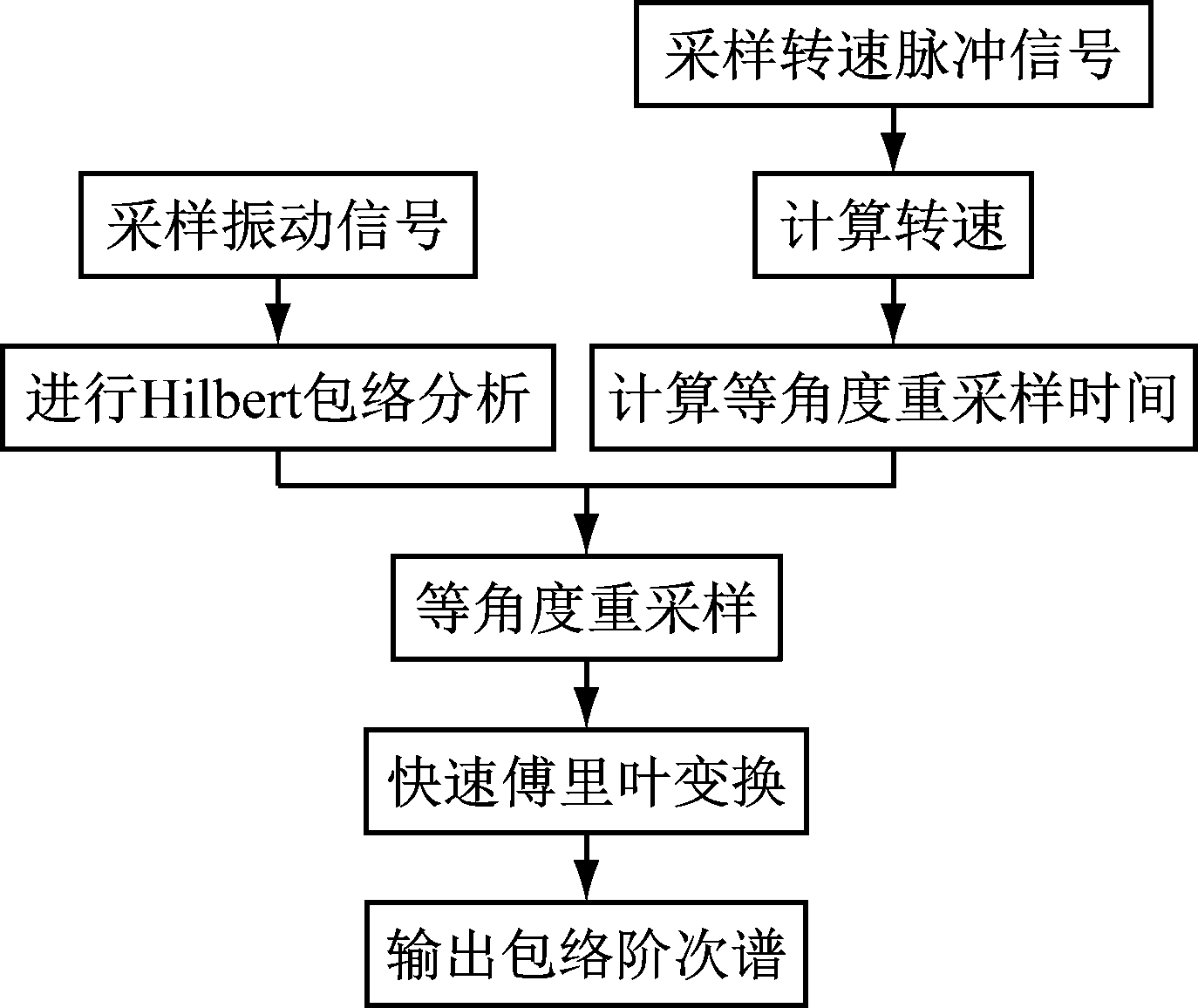 COT以参考轴的转频为基准阶次1,虽然能将时域变速非平稳信号转换为等角度采样的角域平稳信号[11],但由于角域重采样信号存在调制现象,仅通过阶次分析难以达到理想效果。鉴此,首先对原始振动信号进行Hilbert包络分析,并根据转速信号计算等角度重采样时间序列;然后对振动信号包络进行等角度重采样;最后对重采样的角域信号进行FFT分析,得到其包络阶次谱[12-13]。具体流程如图2所示。