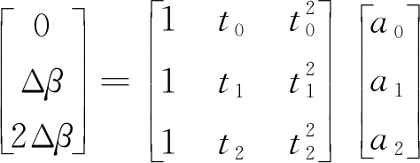 转动相同的转角增量Δβ,通过鉴相装置得到脉冲序列信号,通过相邻2个脉冲间隔时间得到等角度重采样时间的对应转角θ(ti)。t0,t1,t2可直接从脉冲序列信号中提取,将式(2)代入式(3),得到以下矩阵方程: