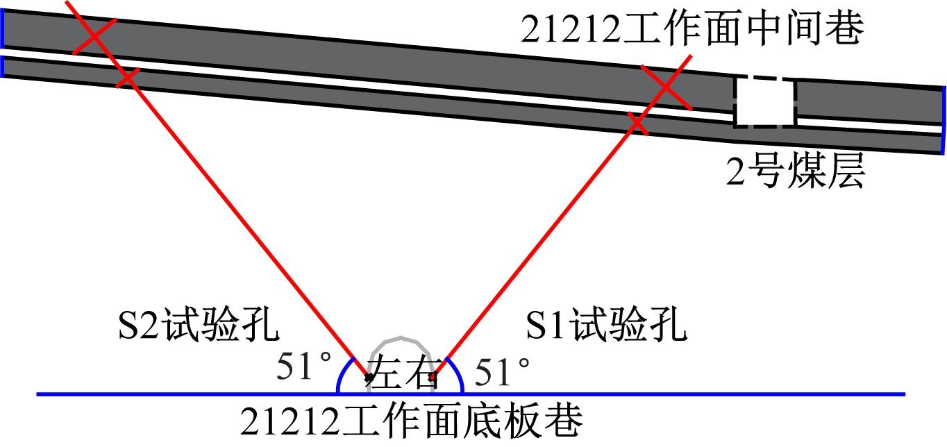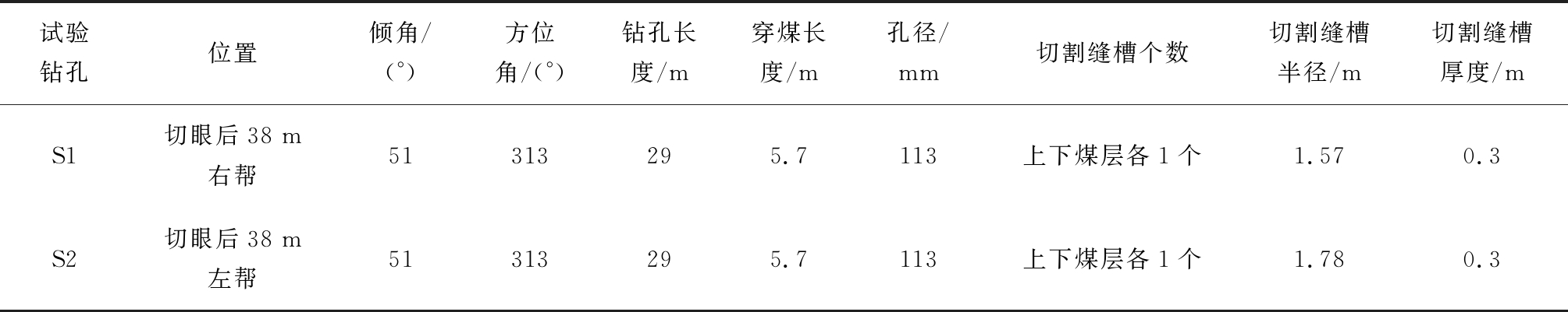 为确定水力割缝的增透效果,在切眼后38 m处设计出煤量为4.5 m3的试验孔S1和出煤量为6 m3的试验孔S2两个水力割缝钻孔,钻孔具体参数见表1,布置如图4所示。