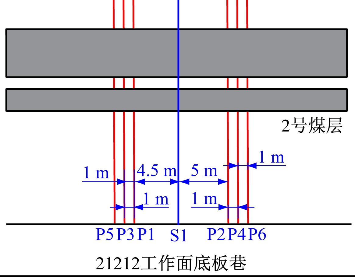 试验钻孔位置倾角/(°)方位角/(°)钻孔长度/m穿煤长度/m孔径/mm切割缝槽个数切割缝槽半径/m切割缝槽厚度/mS1切眼后38 m右帮51313295.7113上下煤层各1个1.570.3S2切眼后38 m左帮51313295.7113上下煤层各1个1.780.3