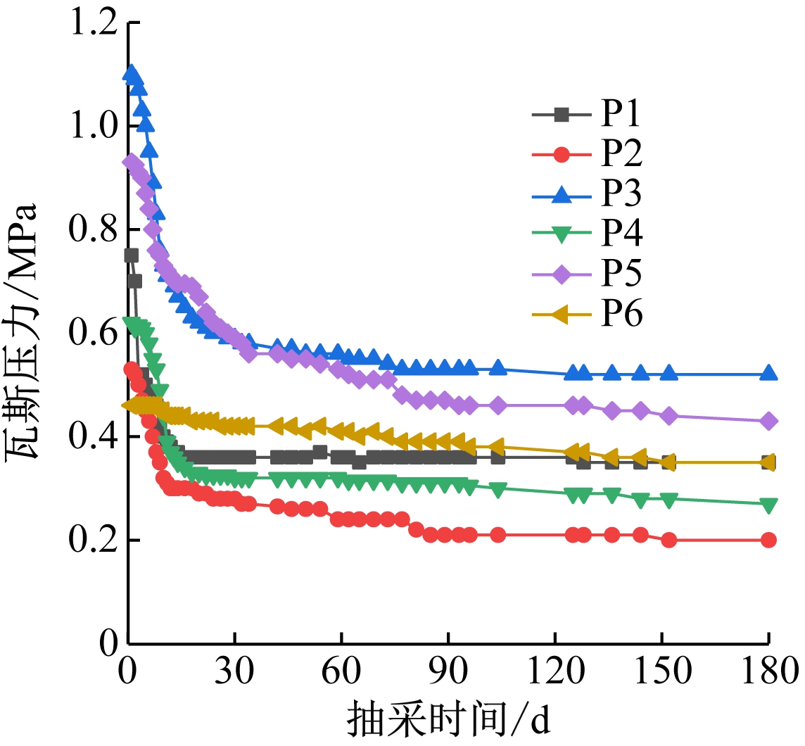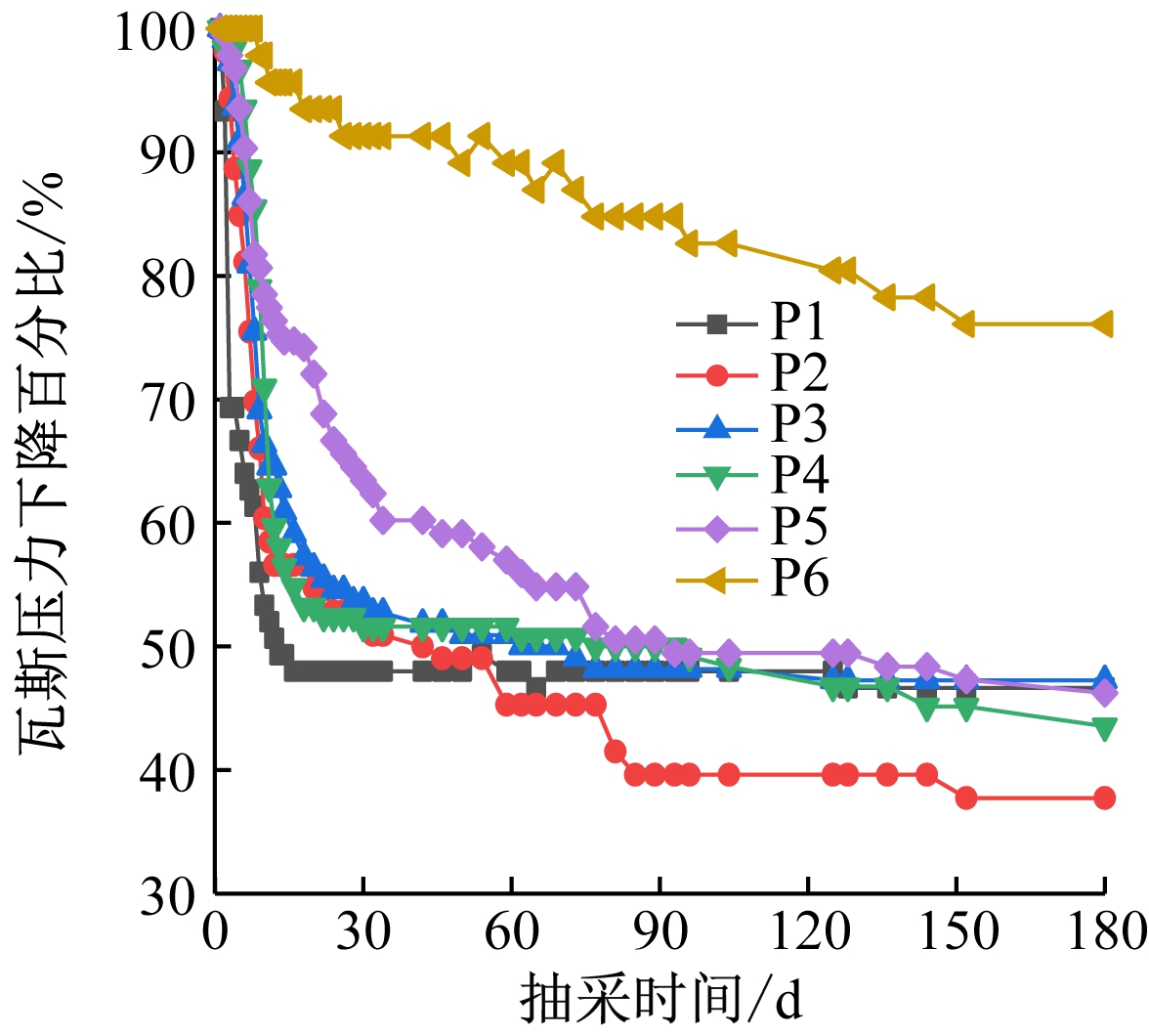 P1—P6测压孔瓦斯压力变化如图8所示。从图8可看出,S1试验孔抽采14 d时,距离试验孔4.5 m的测压孔瓦斯压力降到49%,即抽采14 d的有效抽采半径为4.5 m;抽采44 d时,距离试验孔5 m的测压孔瓦斯压力降到49%,即抽采44 d的有效抽采半径为5 m;抽采73 d时,距离试验孔5.5 m的测压孔瓦斯压力降到49%,即抽采73 d的有效抽采半径为5.5 m;抽采98 d时,距离试验孔6 m的测压孔瓦斯压力降到49%,即抽采98 d的有效抽采半径为6 m;抽采130 d时,距离试验孔6.5 m的测压孔瓦斯压力降到49%,即抽采130 d的有效抽采半径为6.5 m;由于距离试验孔7 m的测压孔瓦斯压力在180 d之内一直没有降到49%以下,抽采180 d的有效抽采半径仍为6.5 m。