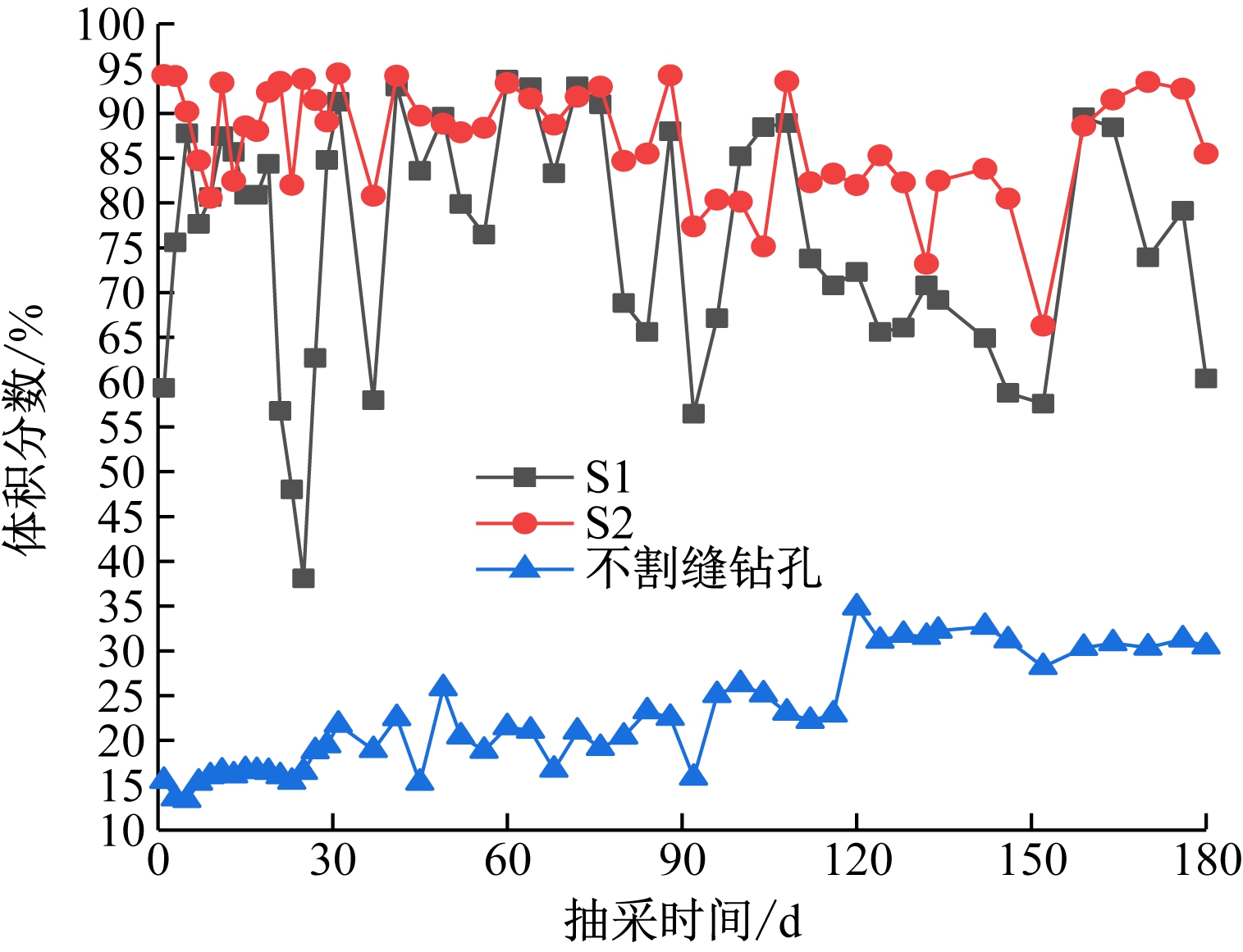 瓦斯抽采体积分数对比如图5所示。可看出不割缝钻孔的瓦斯抽采体积分数最高为34.85%,最低为13.5%,平均体积分数为22.38%;割缝钻孔S1的瓦斯抽采体积分数最高为93.75%,最低为38.09%,平均体积分数为75.73%;割缝钻孔S2的瓦斯抽采体积分数最高为94.44%,最低为66.3%,平均体积分数为86.91%。由此可知,和不割缝钻孔相比,进行水力割缝后煤层瓦斯抽采体积分数大幅提升,平均提高约4倍。