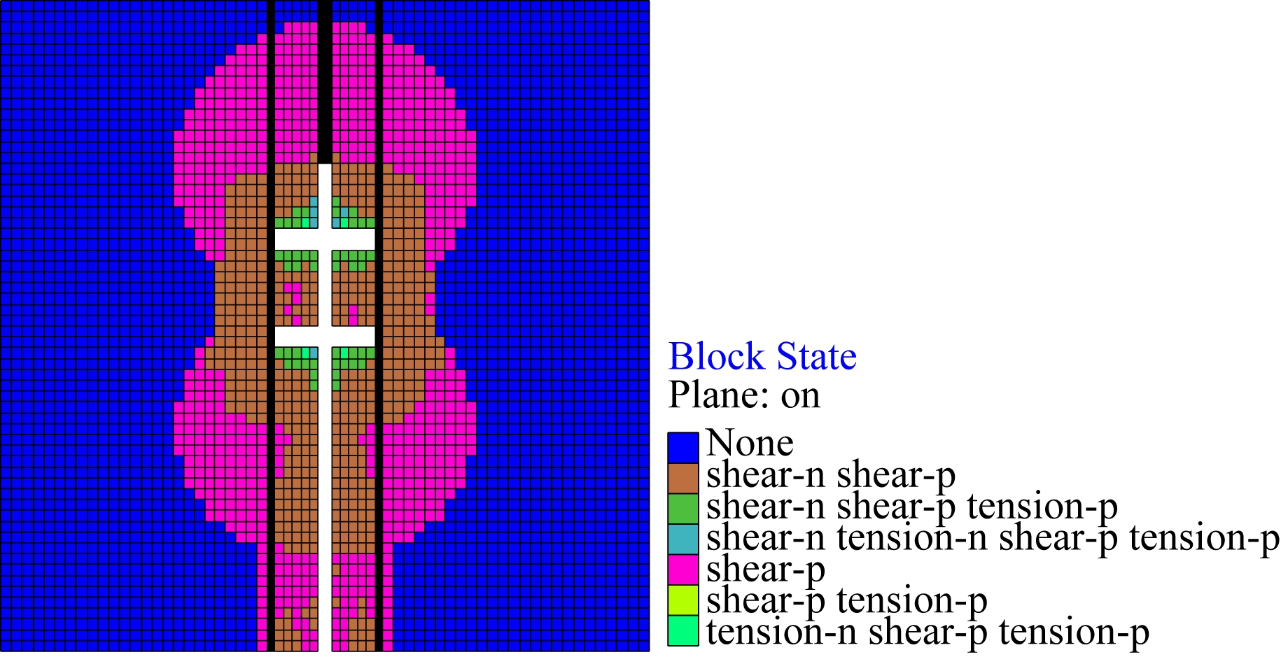 根据以往水力割缝技术施工经验,并结合东庞煤矿情况,确定了水力割缝水压为30 MPa、出煤量为4.5 m3(缝宽为0.3 m,缝深为1.57 m,上下煤层双割缝)和出煤量为6 m3(缝宽为0.3 m,缝深为1.78 m,上下煤层双割缝)的模拟方案。经过计算机模拟,得出煤量为4.5,6 m3时煤层破裂范围,水力割缝煤岩破坏效果如图2和图3所示。由图2、图3可知,用水压为30 MPa的水射流进行割缝,在煤体内部产生大量裂隙。上下煤层协同出煤,割缝之间的裂隙相互连通,致裂区域变大。钻孔周围的应力场经过2次重分布,卸压效果明显增强。通过测量塑性区剪切破坏单元(shear-p)范围来确定煤层破裂区域半径。经测量可得:出煤量为4.5 m3时,煤层破裂区域半径为4.5 m;出煤量为6 m3时,煤层破裂区域半径为4.8 m。