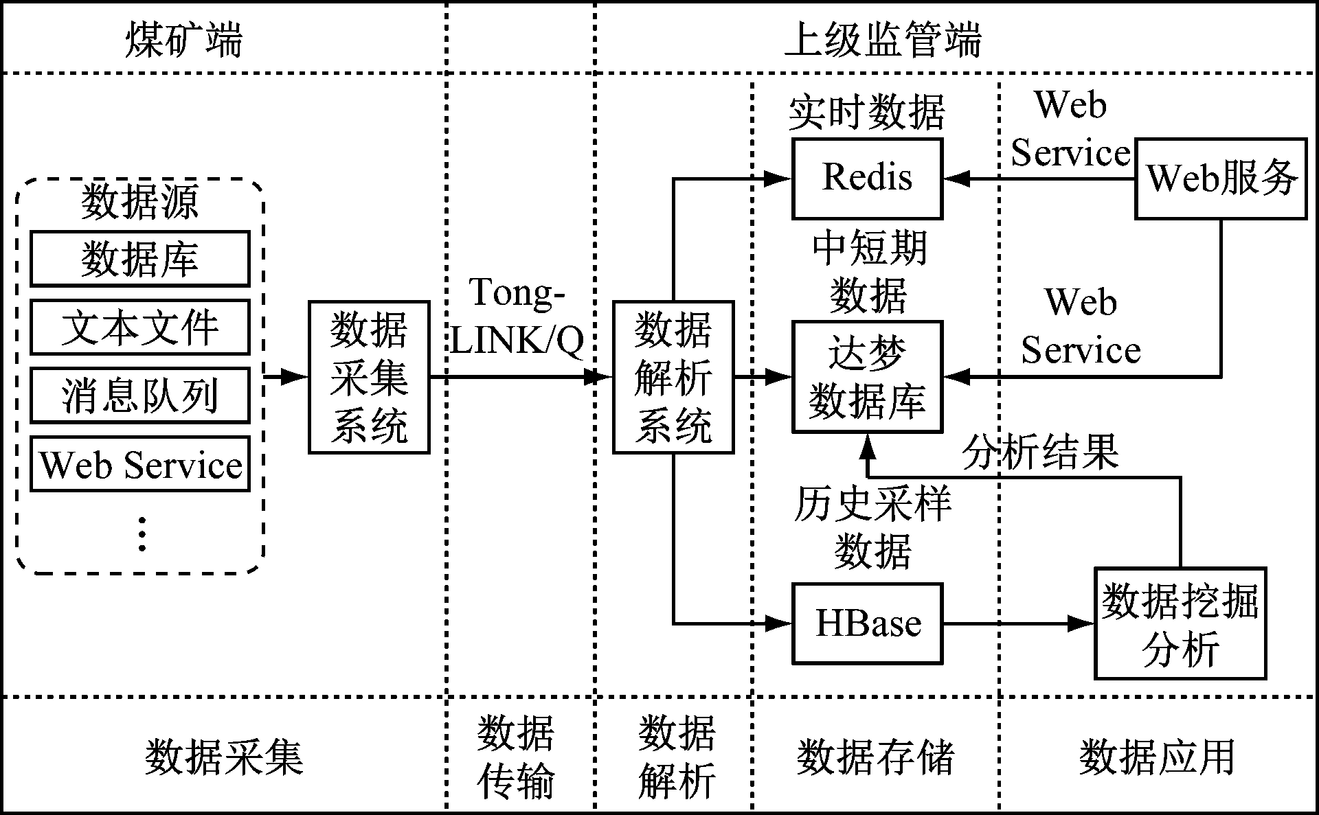 基于国产化的煤矿安全监控系统联网平台[6-7]主要包括煤矿端和上级监管端2个部分。从数据流转角度来看,整个平台架构分为数据采集、数据传输、数据解析、数据存储和数据应用5个环节,如图1所示。首先通过在煤矿端数据采集服务器上部署数据采集系统,将采集到的数据通过消息队列的数据管道传输到上级监管端。然后利用部署在数据分析服务器上的数据解析系统进行数据逆向解析,将解析后的数据分类存储。最后通过数据应用系统进行数据可视化展现。
