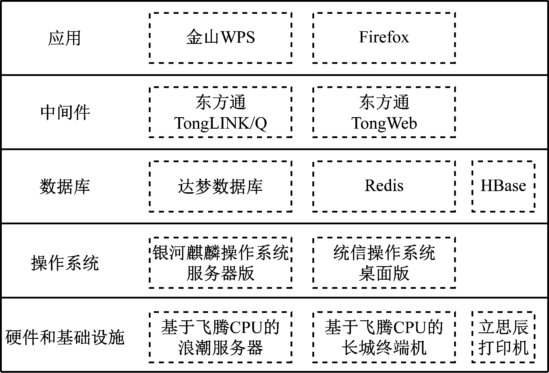 整个平台架构涉及到的软硬件均适配国产化软硬件环境,同时搭配少量Java生态圈的开源框架,如图2所示。按照选取市场主流设备的原则,服务器和终端机CPU均采用飞腾处理器,打印机采用立思辰打印机;服务器操作系统采用银河麒麟,终端机操作系统采用统信;数据库采用开源内存数据库Redis、国产关系数据库达梦和开源列式存储数据库HBase;中间件采用东方通的TongLINK/Q和TongWeb;办公套件采用金山WPS,浏览器采用Firefox。