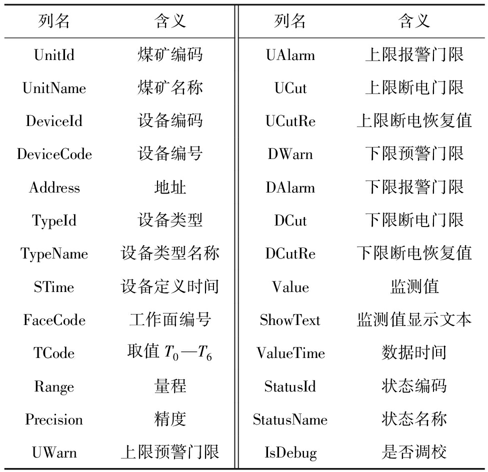 列名含义列名含义UnitId煤矿编码UAlarm上限报警门限UnitName煤矿名称UCut上限断电门限DeviceId设备编码UCutRe上限断电恢复值DeviceCode设备编号DWarn下限预警门限Address地址DAlarm下限报警门限TypeId设备类型DCut下限断电门限TypeName设备类型名称DCutRe下限断电恢复值STime设备定义时间Value监测值FaceCode工作面编号ShowText监测值显示文本TCode取值T0—T6ValueTime数据时间Range量程StatusId状态编码Precision精度StatusName状态名称UWarn上限预警门限IsDebug是否调校