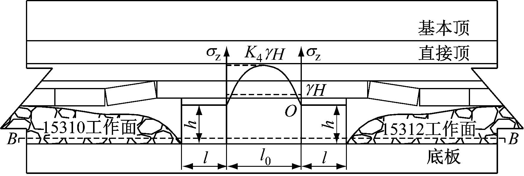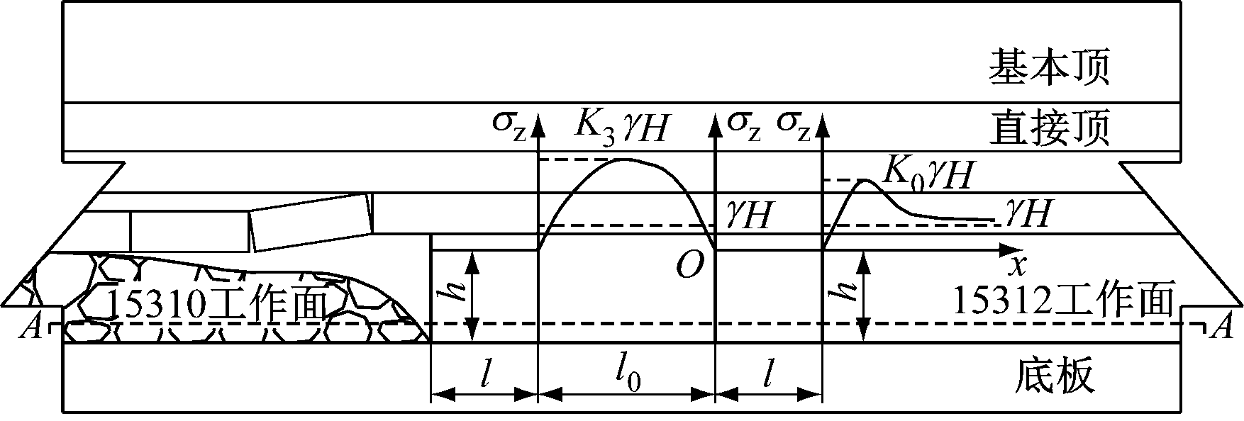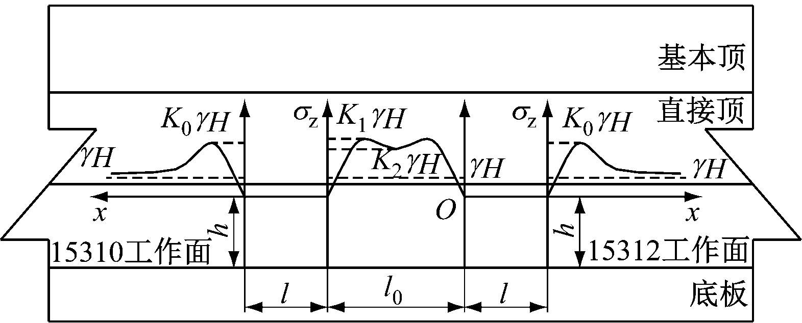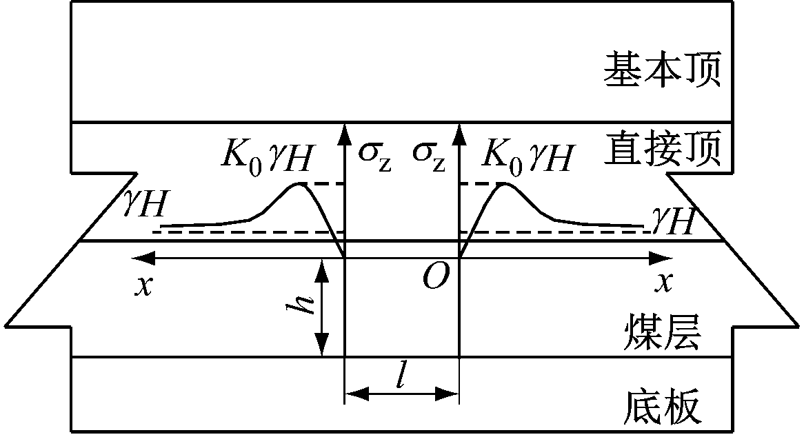 对于进风平巷掘进扰动,巷道开挖后围岩应力重新分布,帮部围岩由浅部到深部垂直应力先增大后减小,之后逐渐恢复到原岩应力状态,此时工作面侧的帮部围岩应力集中系数为K0,煤柱位置的应力集中系数为K1和K2,K1>K0。单一巷道掘进后的帮部围岩垂直应力分布如图2(a)所示,相邻巷道掘进后的帮部围岩垂直应力分布如图2(b)所示。其中,γ为覆岩密度,H为埋深,l为巷道宽度,h为巷道高度,σz为垂直应力,x为距巷道表面的距离,l0为煤柱宽度。