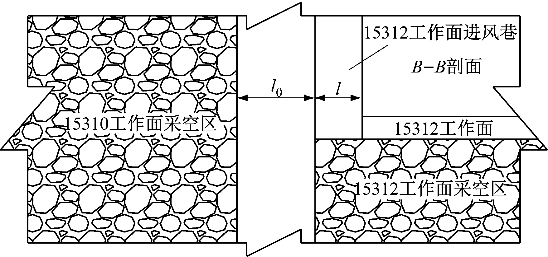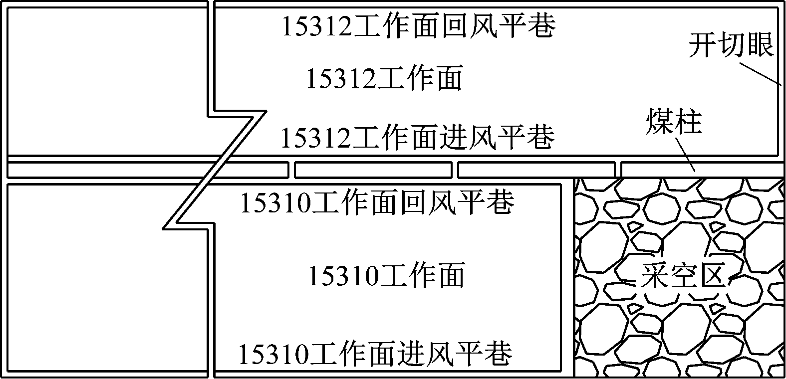 上述研究成果极大丰富了高帮类巷道或受动压影响巷道的围岩变形特征和稳定性控制技术,但大多是基于单一影响因素的稳定性研究,很少涉及巷道在高帮和动压两方面综合作用下的围岩变形规律和稳定性控制,即动压高帮类巷道围岩稳定性控制研究。动压高帮类巷道是指服务期限内受动压影响严重、巷帮高度较大的巷道,其围岩变形特征是断面尺寸和动载影响下耦合作用的结果。不同地质条件下的围岩变形规律和破坏特征又显现出不同。基于此,本文以某矿15312工作面高帮进风平巷为研究对象,探讨该平巷在动压影响下的破坏机理,通过优化原有的支护参数,保证该动压高帮回采巷道的稳定性,为类似条件下的动压高帮回采巷道围岩稳定性控制提供借鉴和参考。