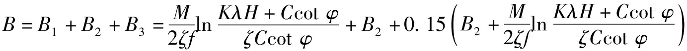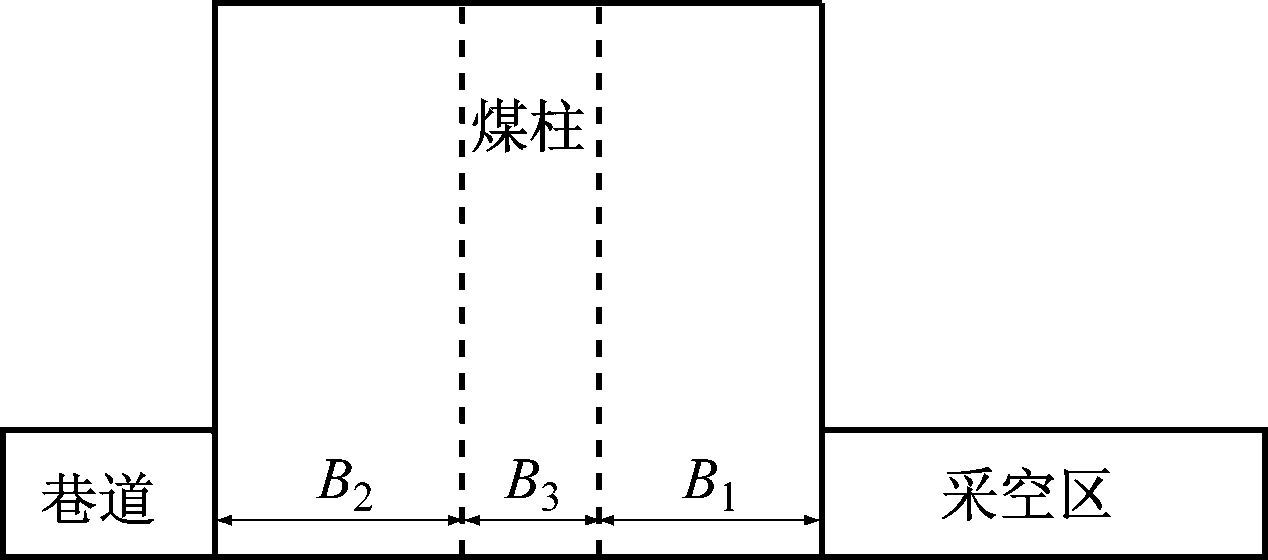 式中:B1为煤柱在采空区侧的塑性区宽度;B2为煤柱安全系数;B3为帮锚杆深入煤体的有效长度;M为采高;ζ为侧压系数;f为煤体承载能力稳定时的应变系数;K为应力集中系数;λ为上覆岩层容重;H为巷道埋深;C为黏聚力;φ为煤体内摩擦角。