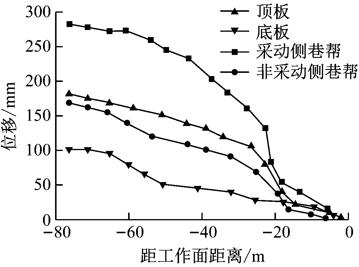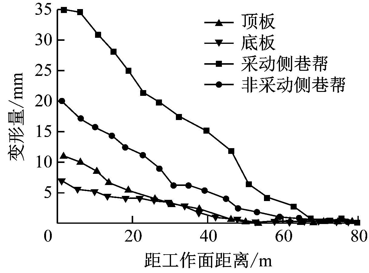 将乌兰木伦煤矿四盘区12煤沿空留巷煤柱宽度设置为5 m,进行现场工业性试验。在工作面前后方各80 m范围内设置多组测站,监测巷道顶底板及两帮变形量,结果如图10所示。可看出采动影响下工作面前后方巷道变形量差异较大,工作面前方巷道变形量比后方少1个数量级;巷道变形不对称,采动侧巷帮变形量大于非采动侧,顶板变形量基本上大于底板;工作面前方50 m范围内巷道变形量较50 m后大,但整体不大,工作面后方60 m后巷道变形量基本不变,顶板覆岩移动变形基本稳定。监测结果验证了沿空留巷煤柱宽度合理,配合相应锚杆支护可有效抑制巷道围岩变形。