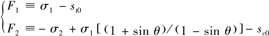 式中:F1为岩石单轴抗拉强度应力状态;σ1为拉应力;st0为岩石单轴抗拉强度;F2为岩石单轴抗压强度应力状态;σ2为剪应力;θ为岩石内摩擦角;sc0为岩石单轴抗压强度。