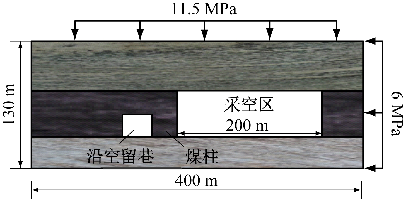数值计算模型如图7所示。模型尺寸为400 m×130 m(长×宽),上覆岩层载荷为11.5 MPa,水平应力为6 MPa,底边施加固定约束,右侧为长200 m的采空区,左侧为沿空留巷煤柱。