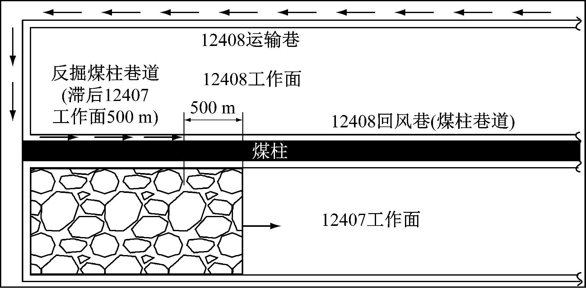 乌兰木伦煤矿可采煤层为12,22,31煤,现主采12,31煤,平均埋深为150 m。12,22煤平均层间距为23 m,22,31煤平均层间距为33 m。12408工作面宽度为298 m,推进长度为2 387 m,煤层厚度为1.8~2.9 m;巷道宽度为5.4 m,高度为2.8 m,直接顶为砂岩,直接底为粉砂岩。12407工作面回采过程中,在煤柱边缘采用切顶方法切断煤柱边缘基本顶与采空区顶板之间的联系,保留1个煤柱,掘进12408工作面区段巷道,如图1所示。
