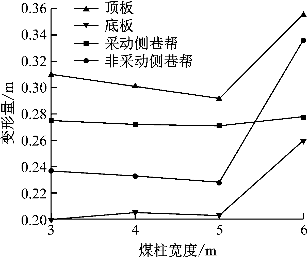 煤柱宽度不同时巷道顶底板、巷帮变形量如图8所示。可看出巷道底板变形量稍大于顶板,采动侧巷帮变形量大于非采动侧;采动侧巷帮变形量随煤柱宽度改变的变化量较小,这与文献[24]提出的留巷侧巷道变形属于“限定变形”(指承载体承担起大结构内覆岩运动产生的作用载荷,对巷道进行支承保护)较为一致,验证了考虑非均质性-损伤效应确定沿空留巷煤柱宽度的合理性及正确性;巷道整体变形量随煤柱宽度增大逐渐减小,但在煤柱宽度为6 m时发生突变,表明巷道稳定性随煤柱宽度增大先升高后降低。
