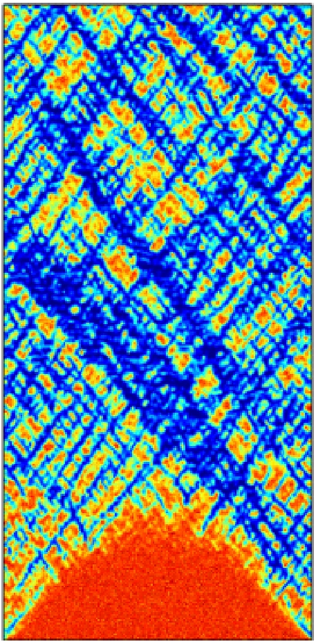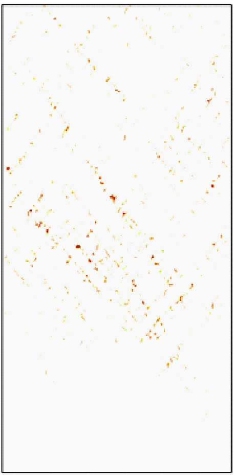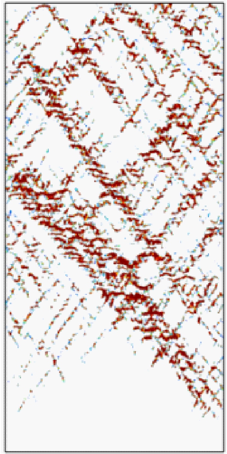 岩样应力-应变曲线上A,B,C点分别对应弹性阶段、塑性阶段、破坏阶段,其弹性模量损伤及裂隙发育分别如图5、图6所示。可看出在弹性阶段,仅有少量强度较低的颗粒发生破坏,破裂点较离散;在塑性阶段,裂隙已开始发育,并出现贯通现象;在破坏阶段,剪切裂纹在岩样中心扩展、贯通,形成沿对角线方向的宏观剪切裂纹。模拟实验与实验室实验得到的破裂形态较一致,验证了岩石非均质性-损伤效应本构模型的合理性和正确性,且设置的均质度适用于煤岩[22-23]。弹性模量损伤劣化特征与裂隙发育基本一致。由图4可看出,标准试件下方未出现裂隙发育及弹性模量损伤劣化现象,原因是数值计算时将底边固定约束,即各方向位移为0。