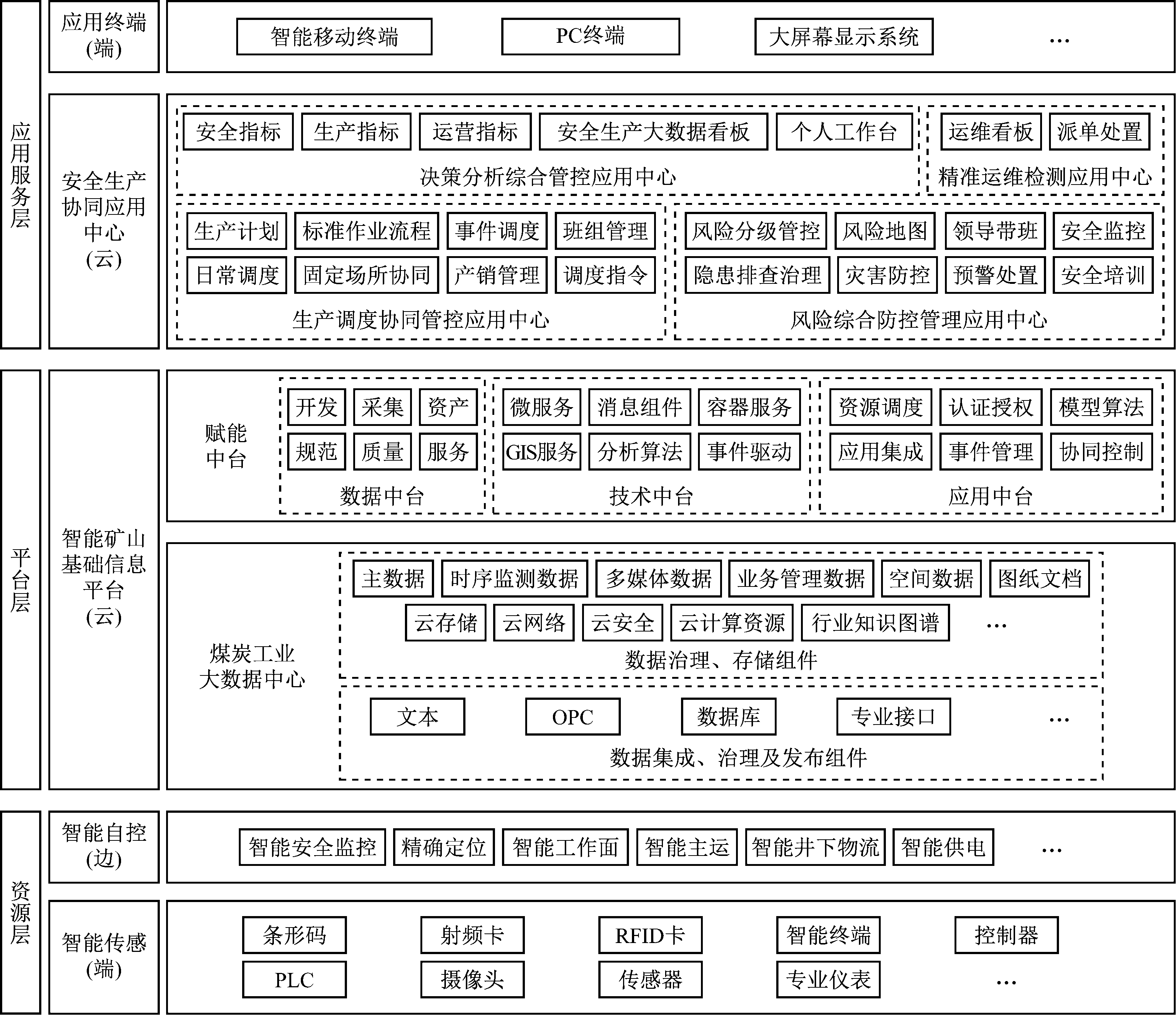 资源层包括智能传感和智能自控,主要实现对作业现场环境、人员、设备的感知与控制。