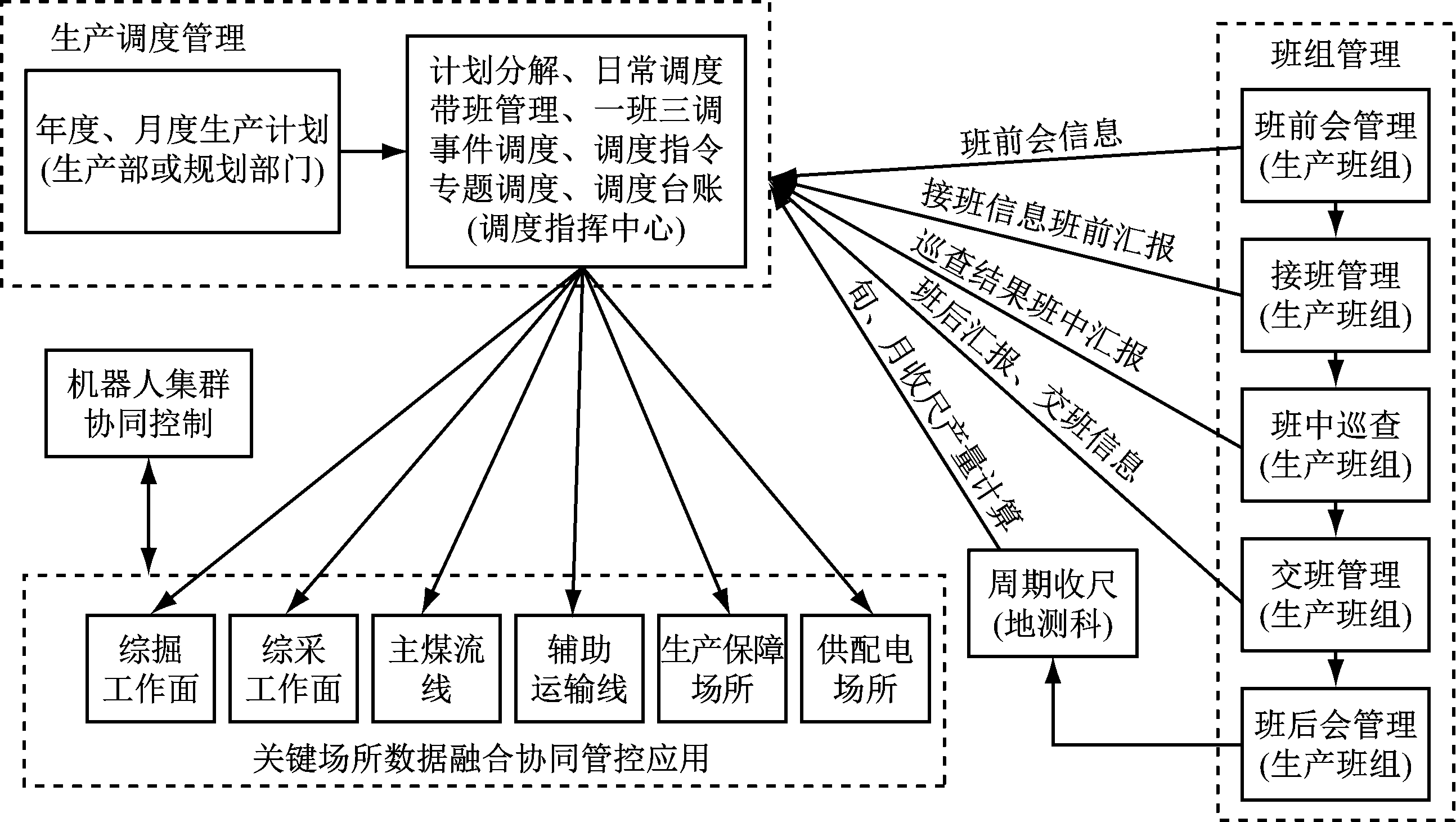 生产调度协同管控应用中心业务包括生产调度管理、班组管理、关键场所数据融合协同管控应用,流程如图3所示。① 生产调度管理。围绕年度、月度生产计划,实现计划分解、日常调度、专题调度、调度台账等调度核心业务流程数字化管理,并通过调度指令与事件调度实现调度指挥中心与科室、区队、班组之间的分级调度。② 班组管理。通过班前会管理、接班管理、班中巡查、交班管理、班后会管理等实现班组管理过程数字化,实现煤矿班组与调度指挥中心的数据共享与协同管理。③ 关键场所数据融合协同管控应用。实现基于三维精细模型下煤矿安全生产关键场景(包括综掘工作面、综采工作面、主煤流线、辅助运输线、生产保障场所、供配电场所)的数据融合、业务联动与协同控制。关键场所数据融合协同管控应用与机器人集群协同控制系统进行对接融合,实现煤矿井下危险作业或劳动强度大作业场景下的无人化、少人化集群协同调度控制[15]。