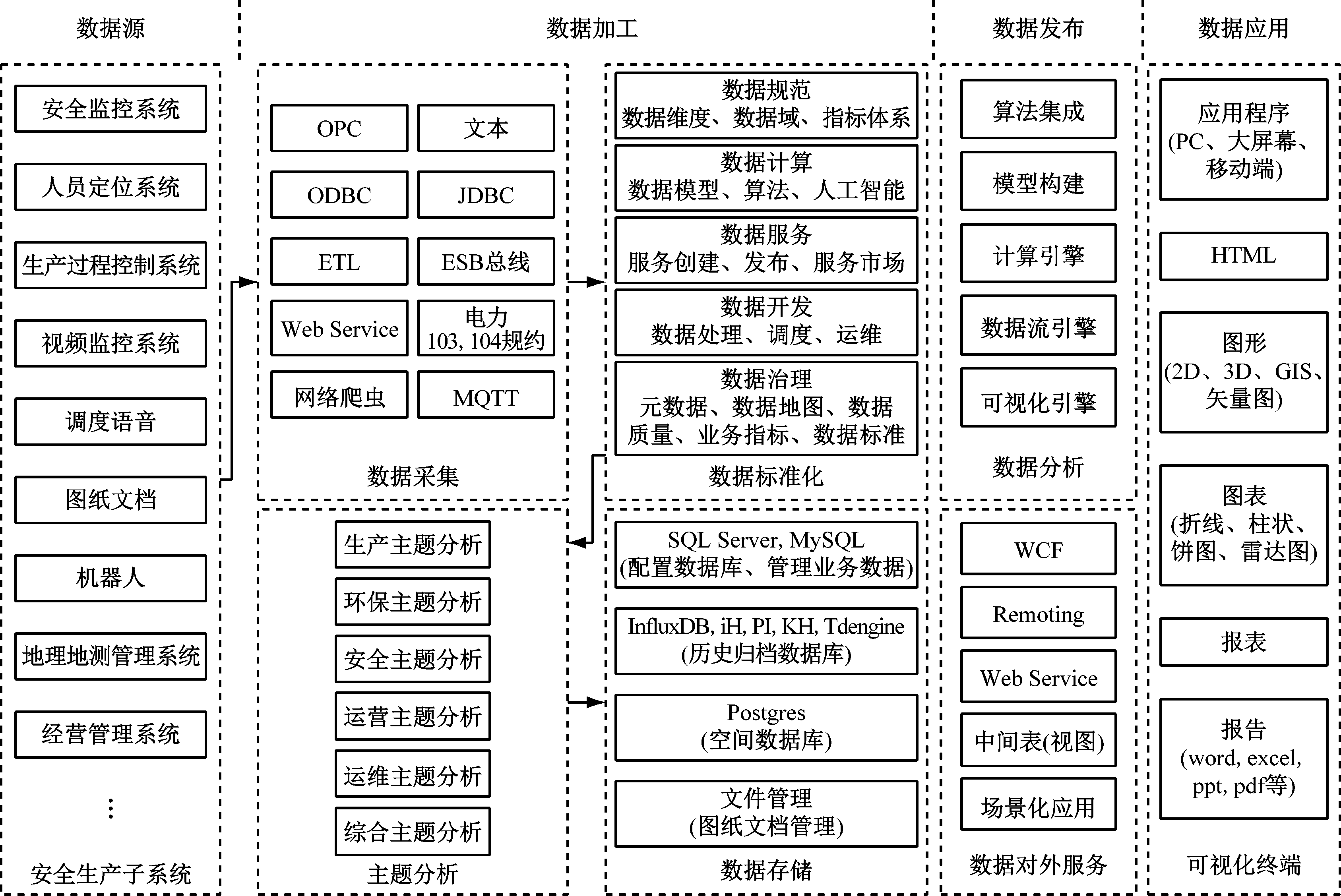 智能矿山综合管控平台数据架构如图2所示。① 数据源。将煤矿各安全生产子系统中涉及的安全、生产、运营相关数据作为智能矿山综合管控平台的数据源。② 数据加工。实现各类异构数据采集,并根据智能化管控应用需求,进行数据治理、主题分析及分类集中存储。③ 数据发布。通过算法集成、模型构建、计算引擎、数据流引擎及可视化引擎,按照业务应用需求进行数据分析,并提供WCF(Windows Communication Foundation, 通信开发平台)、Remoting、Web Service、中间表(视图)及场景化应用的数据对外服务。④ 数据应用。通过应用程序、HTML、图形、报表、图表、报告等可视化组件实现数据前端展示,满足不同层级的业务应用需求[12]。
