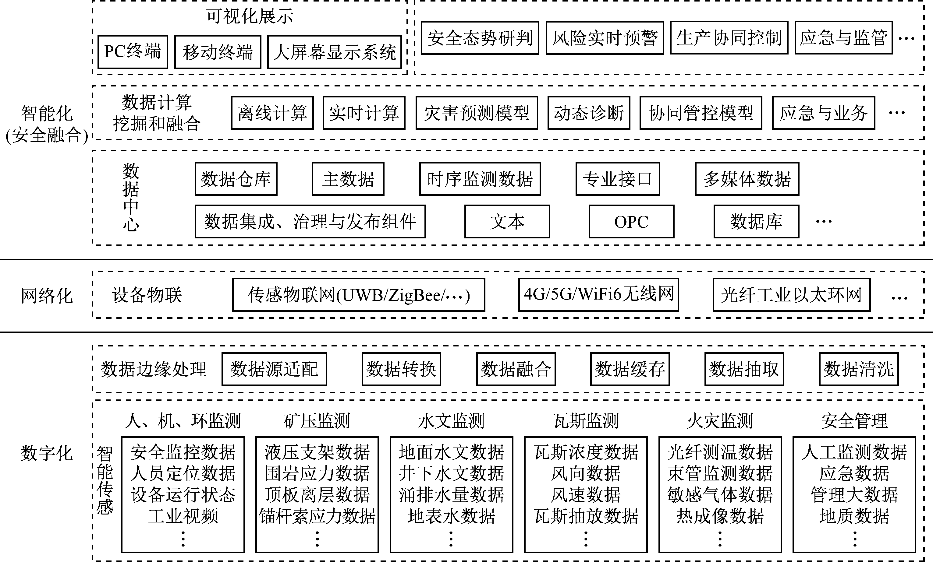 但是煤矿安全智能化建设还存在诸多问题:煤矿安全智能化技术体系不明晰;煤矿典型灾害监测数据未能完全实现自动化、数字化;上传的数据数量少、质量差;监测数据因缺乏融合分析手段而成为离散化的信息孤岛。存在以上问题的原因:① 现有的煤矿智能化设计方案仅明确了煤矿单一灾害系统建设,并未涉及不同灾害预警结果的协同融合,也未提及煤矿安全技术架构体系。② 虽然煤矿安全监测监控系统经过国家新一轮数字化技术升级,统一了相关标准并实现了部分子系统融合,但是由于水、火、瓦斯、矿压、粉尘等典型灾害监测预警系统和安全相关感知系统的数字化水平参差不齐,各系统的融合及其与生产的协同控制还处于研究攻坚过程。因此,应构建煤矿安全智能化架构体系,梳理智能感知、网络传输和智能化平台应用等内容,明确各子系统的协同、耦合关系,通过建设一体化网络及统一的煤矿安全信息平台和应用平台,为煤矿安全智能化实施明确方向。