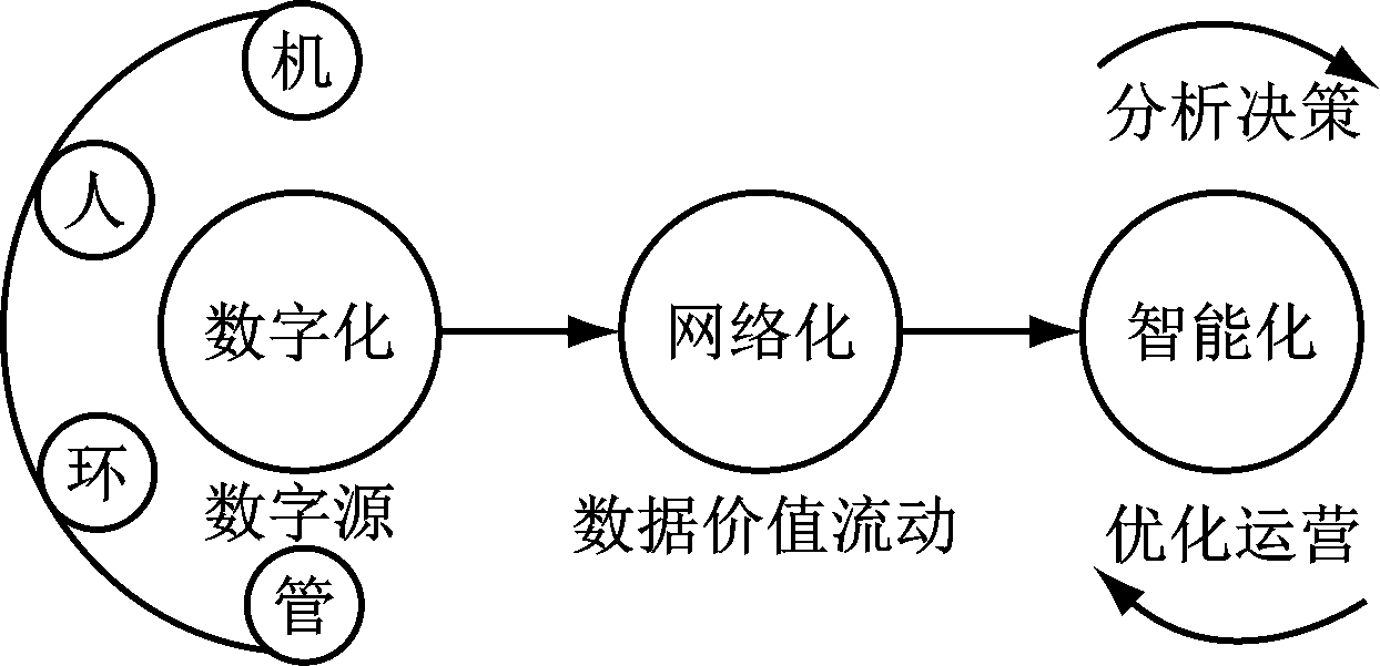 数字化是基础,网络化是支撑,智能化是目标。从工业互联网的本质来讲,实现智能化的前提是数字化[16],决策部分必须依靠数据才能实现智能化分析决策和优化运营。网络化是数据价值流动的途径,智能化是创造经济和社会价值的最终体现。数字化、网络化与智能化的关系如图2所示。