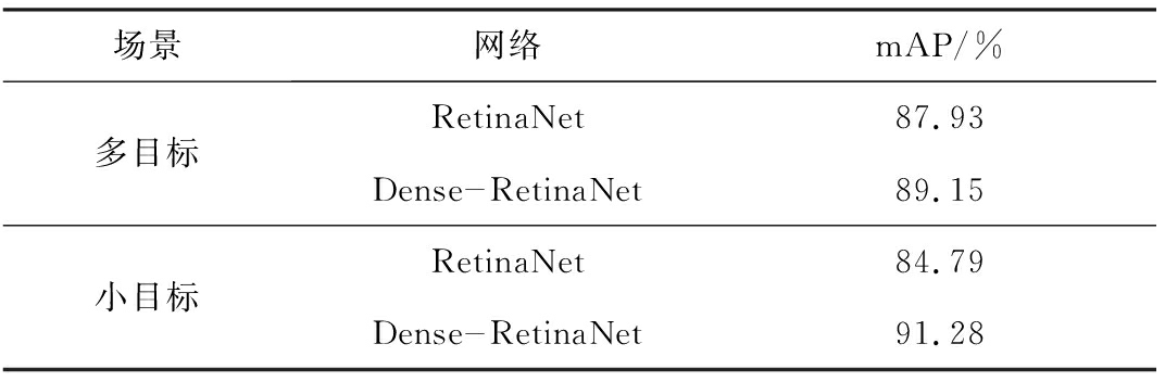 RetinaNet和Dense-RetinaNet检测结果对比见表2。可看出Dense-RetinaNet相较于RetinaNet在多目标检测精度上提高了1.22%,小目标检测精度上提高了6.49%。