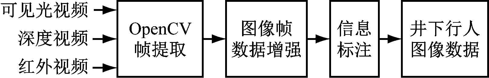 煤矿井下采集的原始数据以视频方式保存,视频数据处理流程如图3所示。首先,将采集的视频经过OpenCV逐帧提取可视度良好的图像帧来获得单张图像。其中,可见光图像分辨率为1 920×1 080,红外图像和深度图像分辨率为400×600。可见光图像和红外图像的通道数为3;深度图像格式为RGB-D,共4个通道,其中前3个通道为图像色彩信息,最后1个通道为图像深度信息。然后,对单张图像进行数据增强(包括直方图均衡[6]、双边滤波、反转、旋转、缩放和平移)。最后,选用LabelImg软件对图像进行手动标注标签,标注的信息包括目标边界、目标类别和目标中心坐标(每张图像中包括的行人数量为1~10)。